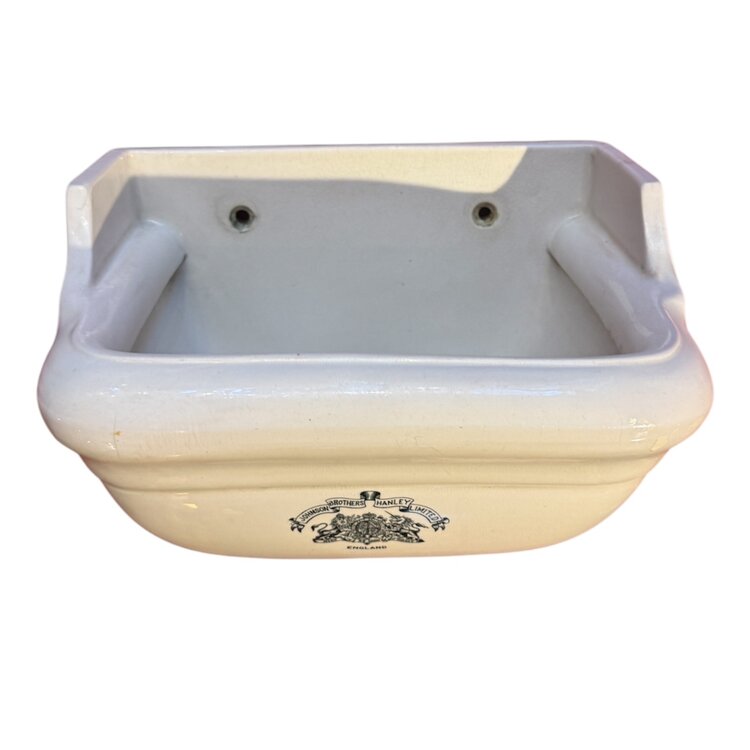 A rare and elegant antique washbasin by Johnson & Brothers Hanley, crafted in bright white ceramic and bearing the original heraldic factory mark reading Johnson Brothers Hanley Limited – England. This is an unusually small model — refined in proportion and increasingly hard to find in this compact size.