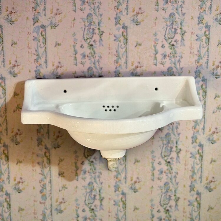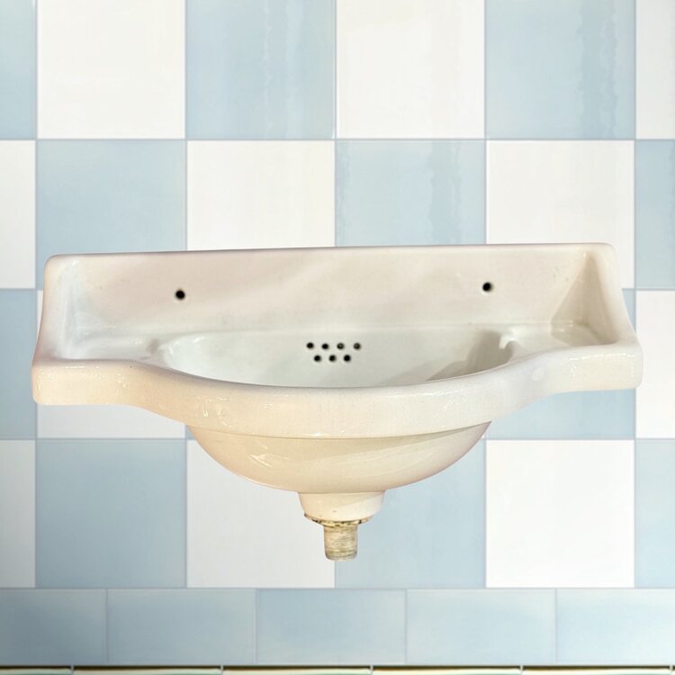 A beautiful antique washbasin by Société Céramique Maastricht, finished in a soft ivory tone and preserved in excellent condition. This piece still bears its original factory stamp with lion emblem and “Made in Holland” mark, as well as the original numbering — an important detail for collectors of authentic Dutch sanitary ware.