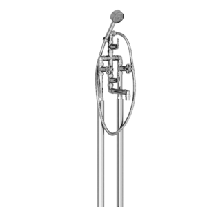 The tap is shown here on tall pillars, but is also available on short pillars (deck-mounted on the rim of the bath) or as a wall-mounted model.