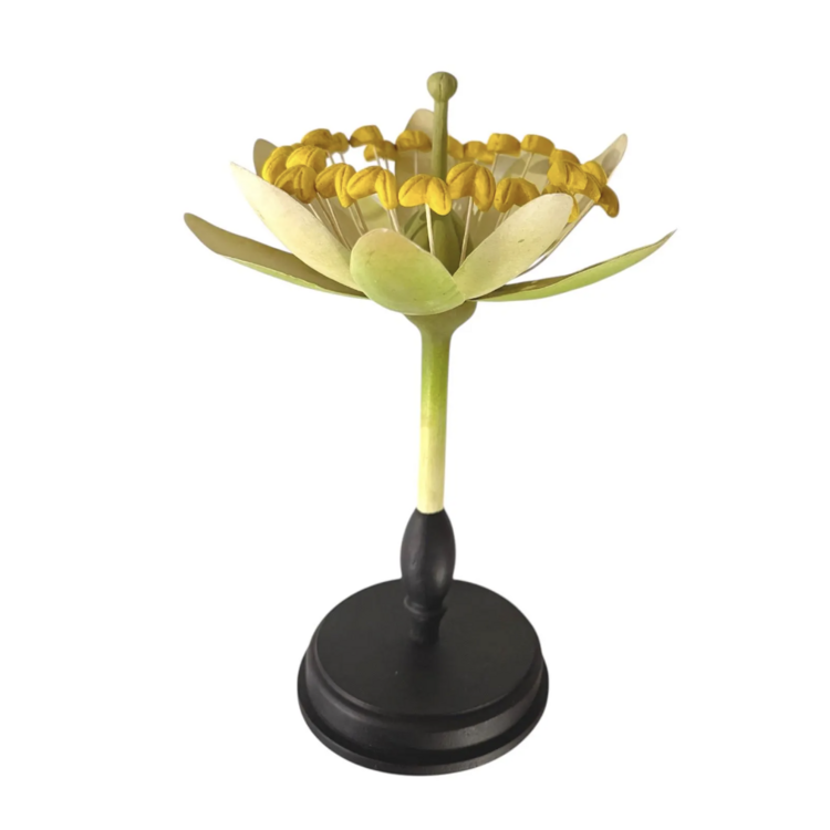 The upper part of the model is made of metal, while the flower is mounted on a round, turned wooden base. The combination of craftsmanship, science and aesthetics makes this object highly decorative.