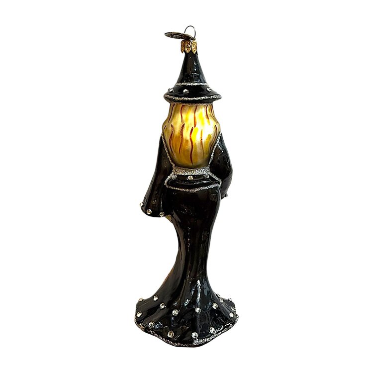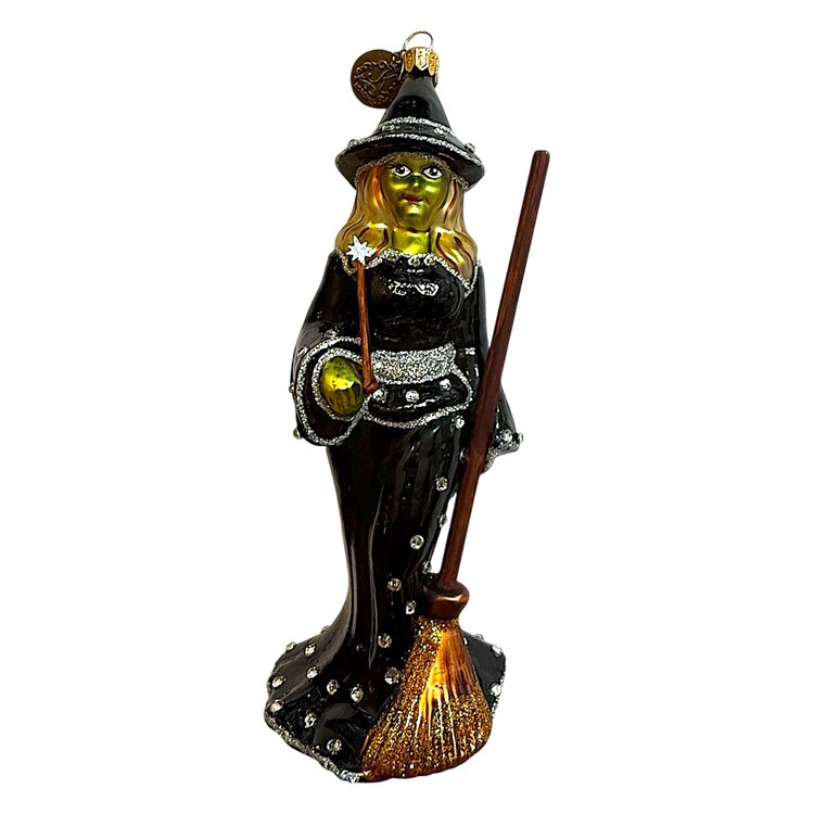 A witch in the Christmas tree! A striking Christmas ornament featuring a standing witch, dressed in a classic black cloak and pointy hat. This unique bauble blends a touch of mystery with festive charm. Ideal for those who enjoy a playful nod to fairytales and folklore during the holidays. A fun and original ornament that fits beautifully in both traditional and quirky Christmas trees.