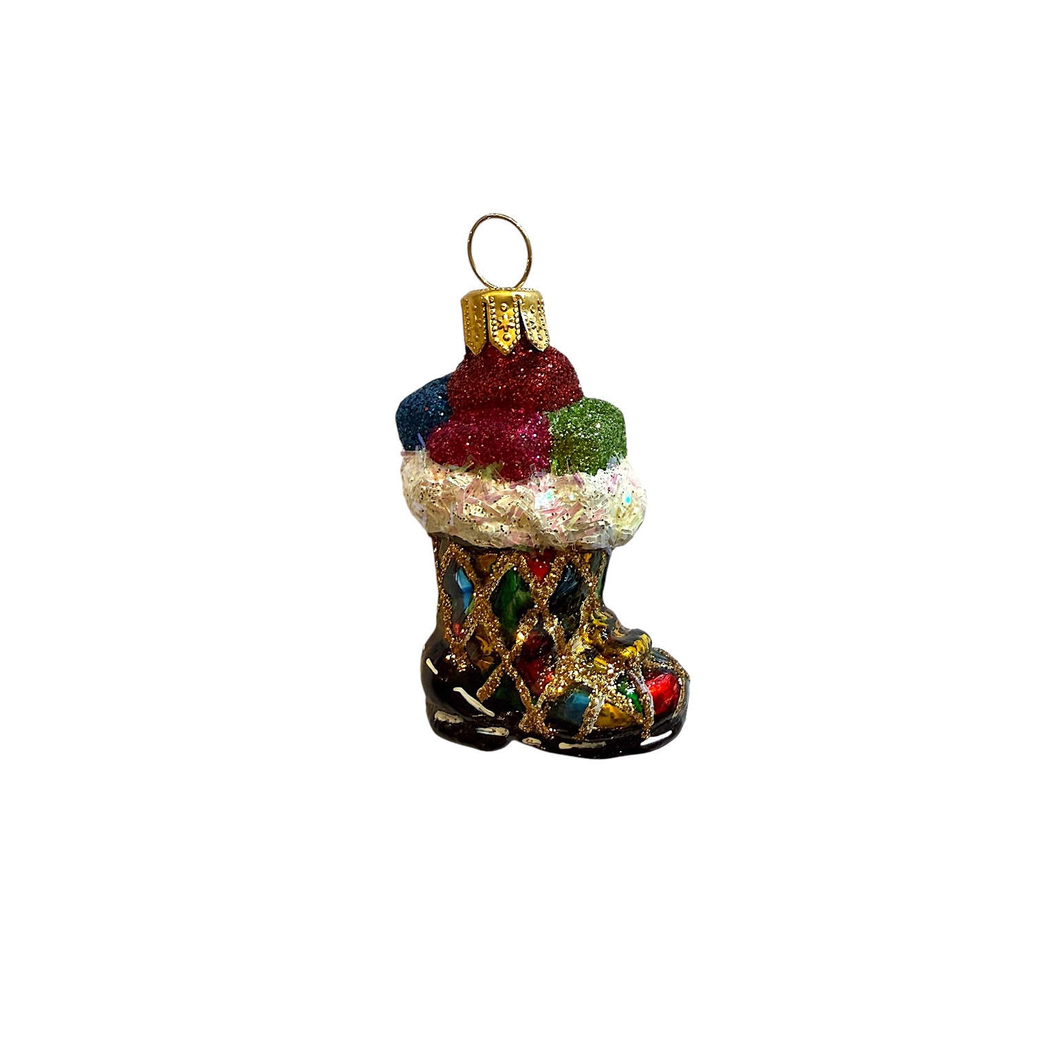 Christmas stocking ornament. Christmas decorations in beautiful thick and richly coloured hand-painted glass.