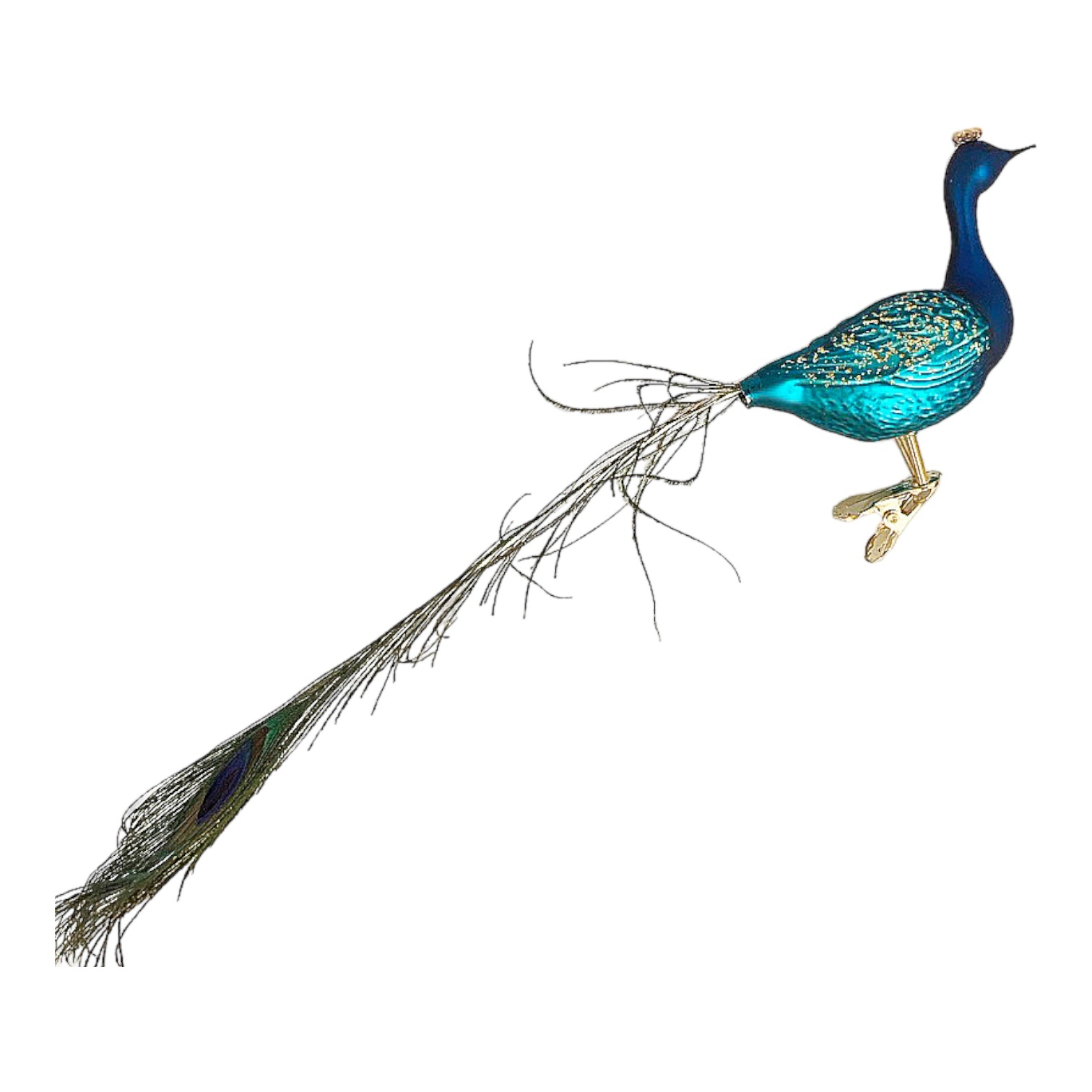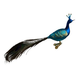 Birds are symbols of happiness and joy, so they are regarded as a necessity on the Christmas tree.This majestic peacock ornament features shimmering glass in regal blues and greens, with a real feather that extends its elegant tail. A striking symbol of beauty and renewal, the proud peacock makes a luxurious addition to any tree. Perfect for lovers of ornate, nature-inspired Christmas décor.