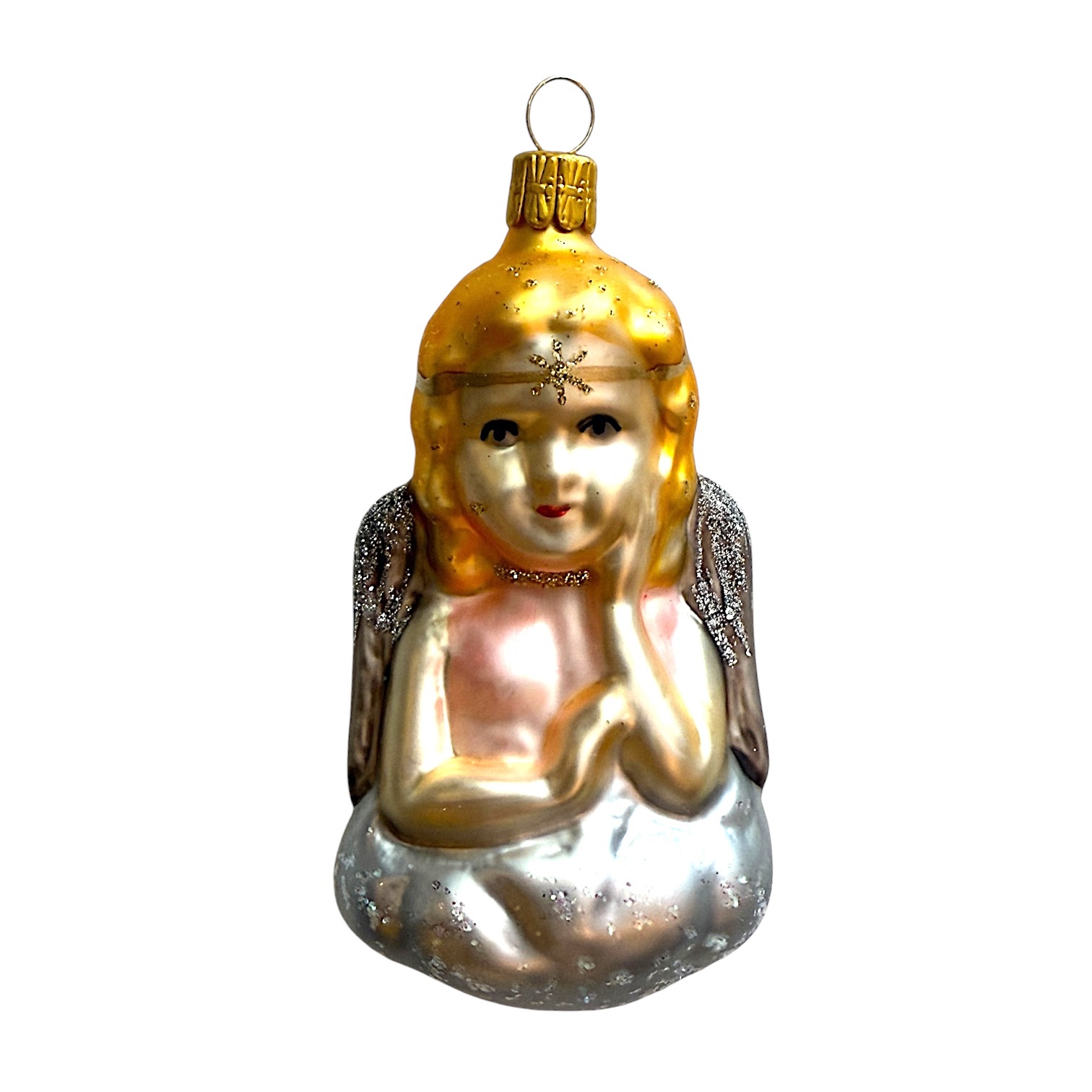 This angel, resting its cheek gently on one hand, seems straight out of a painting by Raphael or Titian. The contemplating angel on a cloud – gazing thoughtfully at the world below – is a timeless Christmas theme, often seen in angel-themed baubles. Its delicate star-topped tiara and shimmering silver wings give this ornament a peaceful, poetic presence. A gentle symbol of wonder, reflection and serenity.