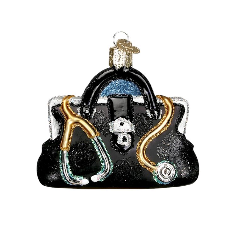 This beautiful glass Doctor's Bag ornament makes a perfect gift for a favourite doctor. A classic doctor’s bag in black with a silver clasp and subtle details – a tribute to the caring profession. This ornament evokes images of trusted physicians bringing calm and care. A thoughtful piece for doctors, nurses, or anyone who values healthcare and compassion. A small symbol of dedication and healing, perfect for the Christmas tree.