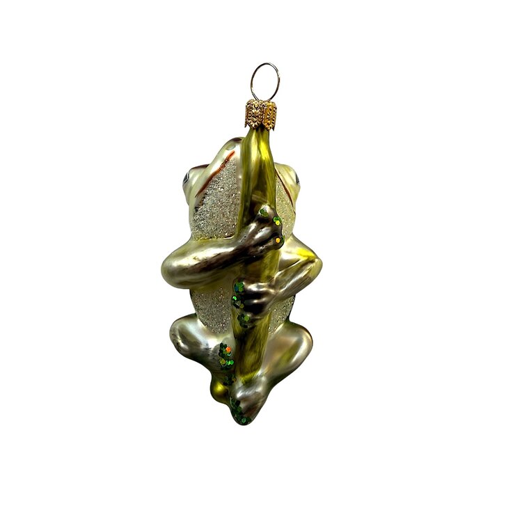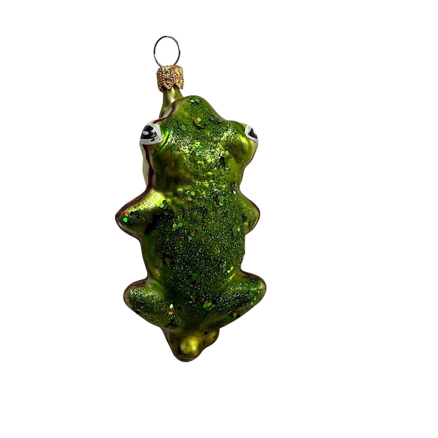 Frog in the Christmas tree! Beautiful mouth blown glass animals for a festive Christmas tree. Bring a touch of playful nature and joy to your Christmas decorations with this handmade frog bauble. This cheerful and unique ornament is perfect for anyone who loves animals and wants to add a fresh, humorous twist to their holiday season.