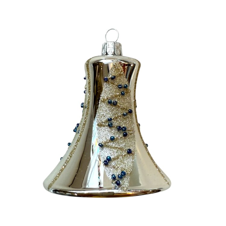 A striking, larger version of the classic bell ornament. This shimmering silver bell is adorned with delicate blue beads that glisten like little drops of music. Inside, as with all our bells, there's a real glass clapper that gently chimes when moved — a subtle and joyful sound. Elegant in shape and rich in detail, this bell is perfect for those who love timeless designs with a festive sparkle. Ring, little bell, ring!