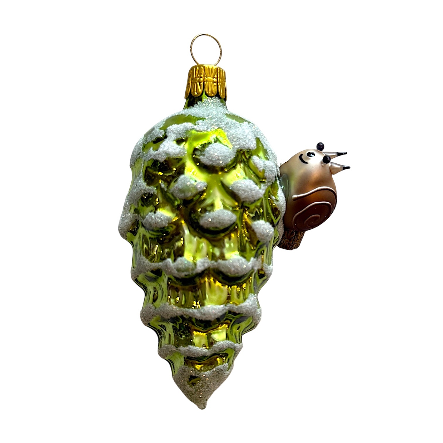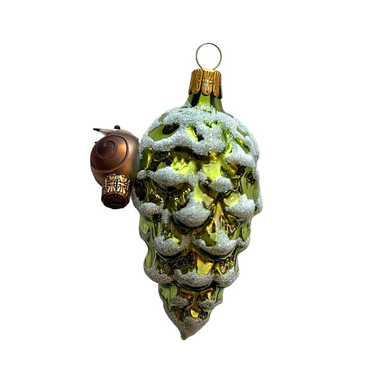 A delicate ornament depicting a serene forest scene: a frosted pine cone with a little snail gently perched on top. The snail is freely blown and detailed by hand, adding depth and charm to this nature-inspired piece. It captures the quiet wonder of the woods in winter—calm, still, and full of tiny life.