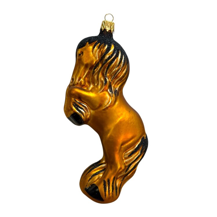 This striking ornament features a rearing horse in rich brown tones with black accents. The horse – a timeless symbol of freedom, strength, and grace – is beautifully captured mid-motion, with raised front legs and a proud, dynamic posture. A bold and elegant ornament that brings life to any Christmas tree.