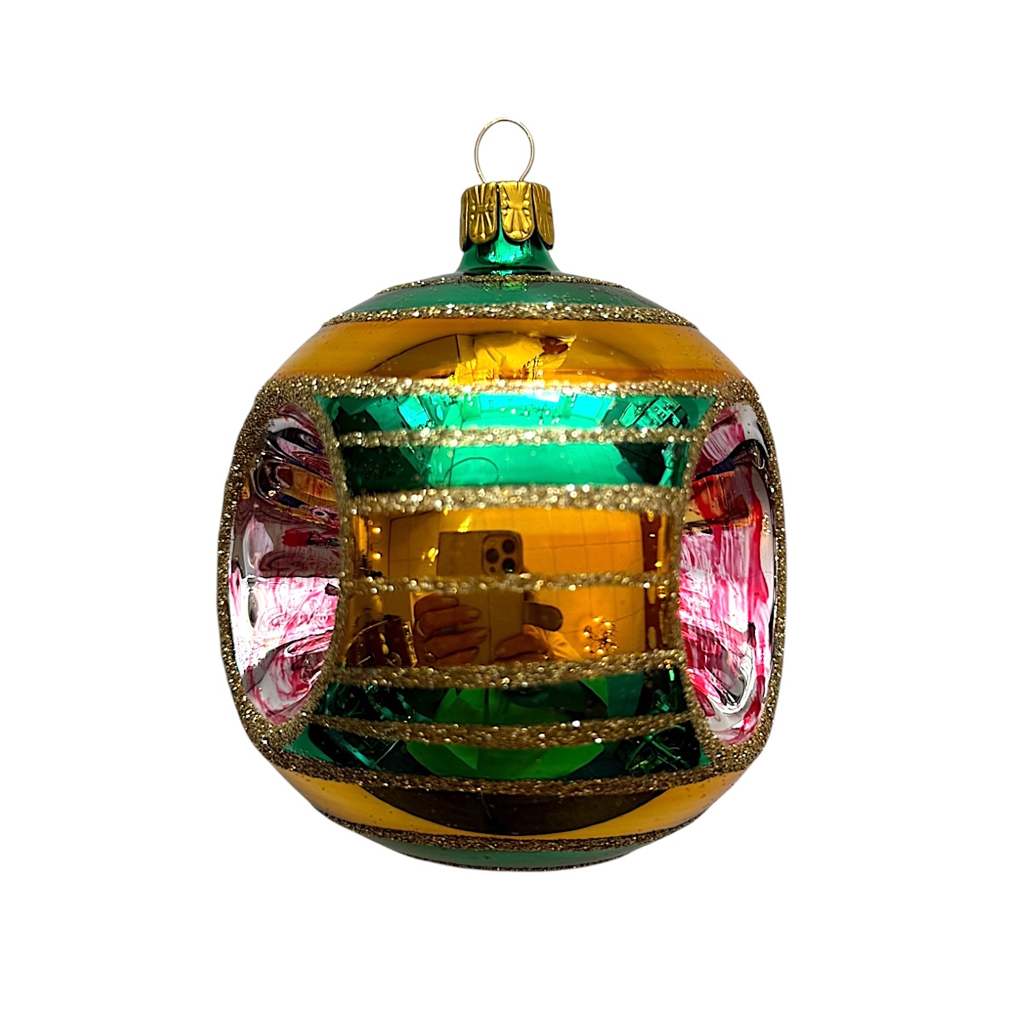 Surrounding the reflector are festive horizontal stripes in golden yellow and bright green, lined with sparkling glitter. Full of cheer and color, this bauble will stand out brilliantly among the branches of your Christmas tree. With its joyful design and retro feel, it's a timeless piece made by hand in one of Europe’s oldest glassblowing studios.