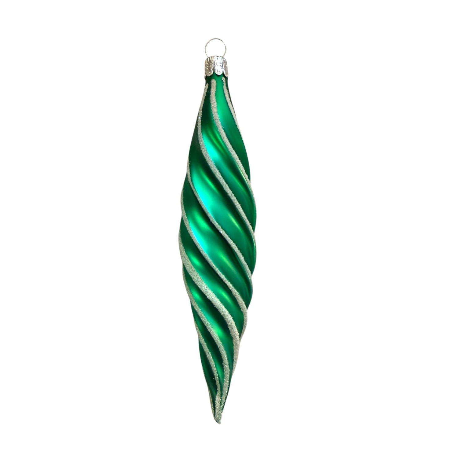 An elegant green icicle-shaped Christmas ornament with graceful twisted lines and subtle glitter details. This classic shape brings beautiful vertical movement to the tree and pairs wonderfully with both traditional festive colors and modern holiday themes. A timeless ornament that evokes nostalgic Christmas charm and deserves a place in every beautifully decorated tree.