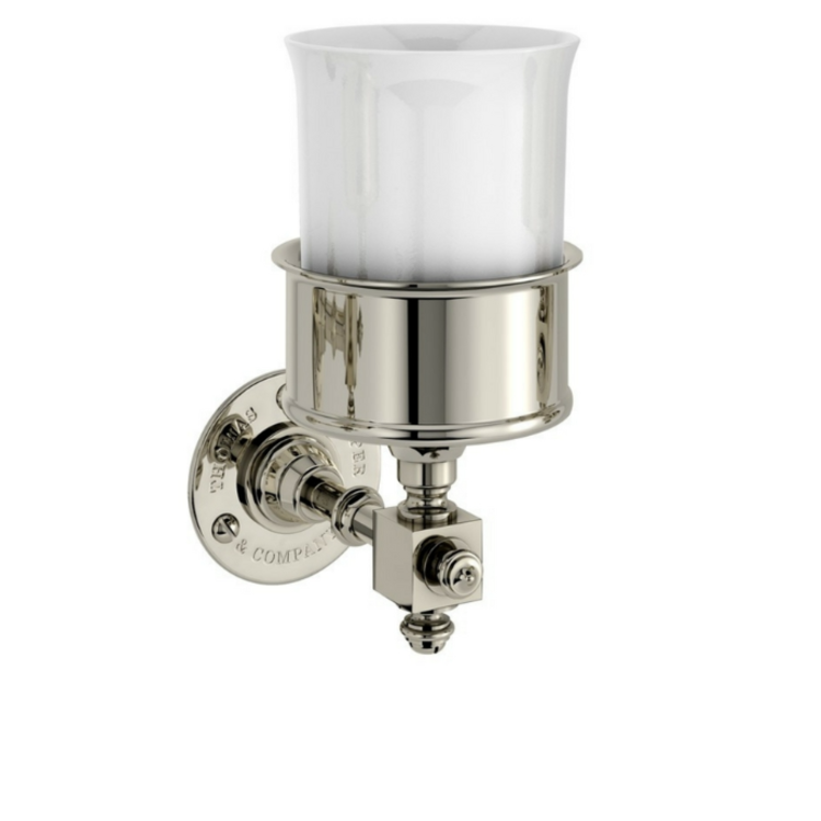 The tumbler holder is from open-work metal and available in chrome, polished nickel or unvarnished brass.