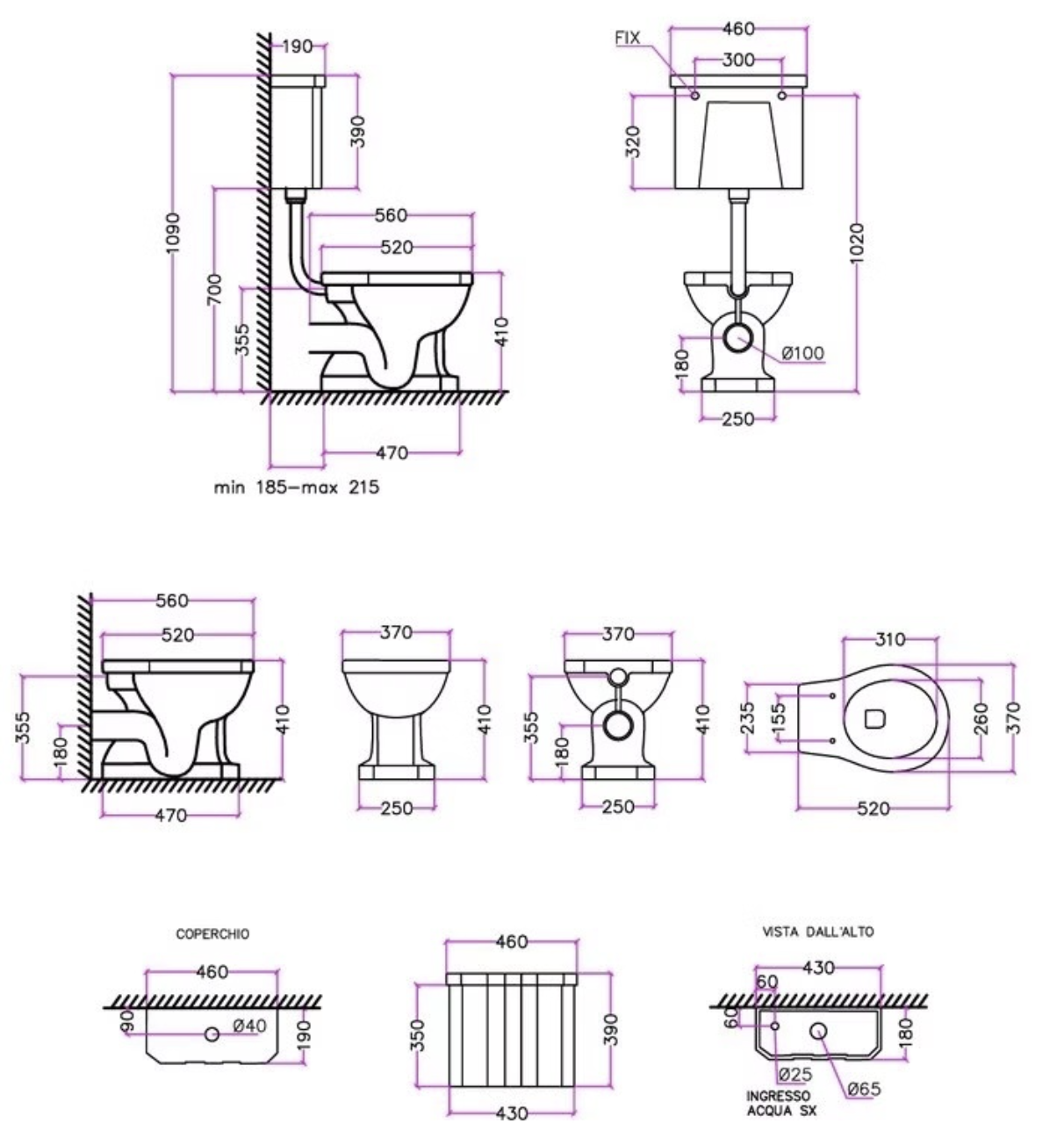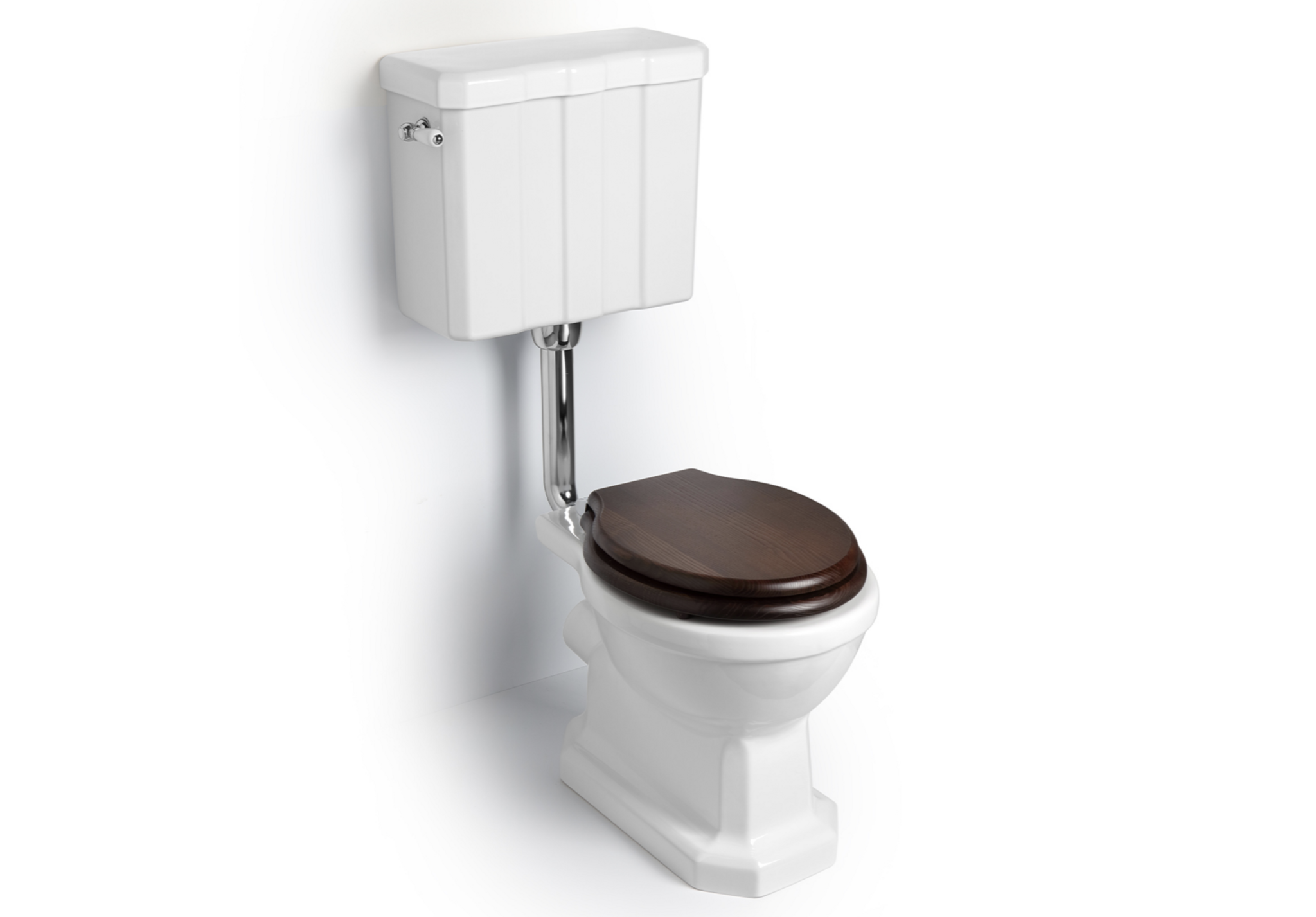 The mid-level cistern is finished with the same geometric simplicity and, together with the chrome or polished nickel pipework, creates a striking vertical feature against the wall. The overall look is authentic and timeless, inspired by interwar sanitary design.