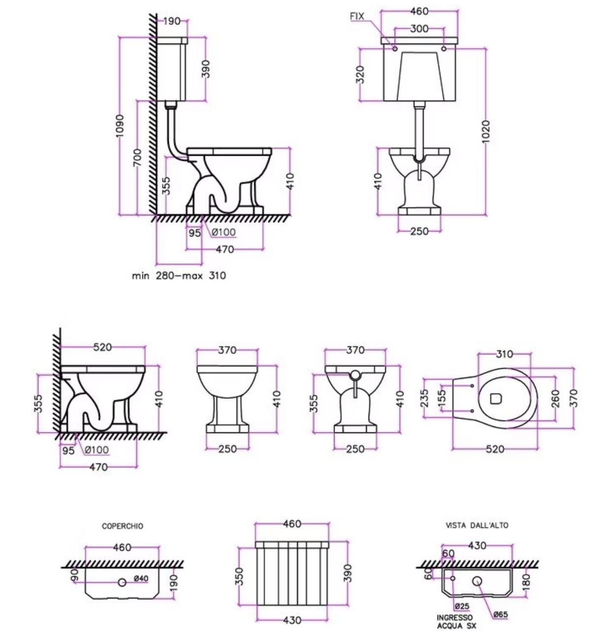 This toilet features an S-trap floor outlet, making it particularly suitable for smaller cloakrooms. The model is also available with a P-trap wall outlet for alternative installations. A technical drawing is included with the additional images.