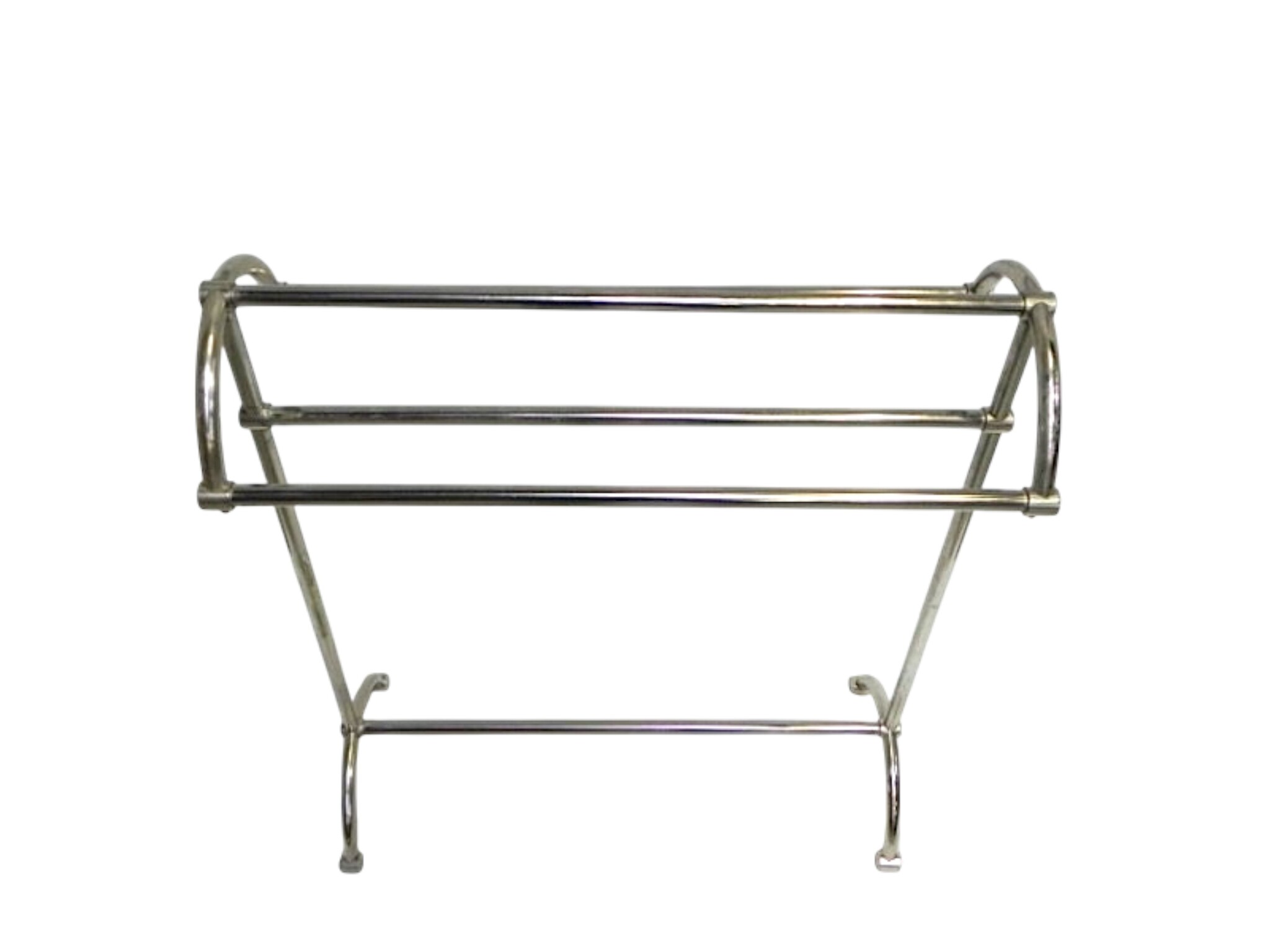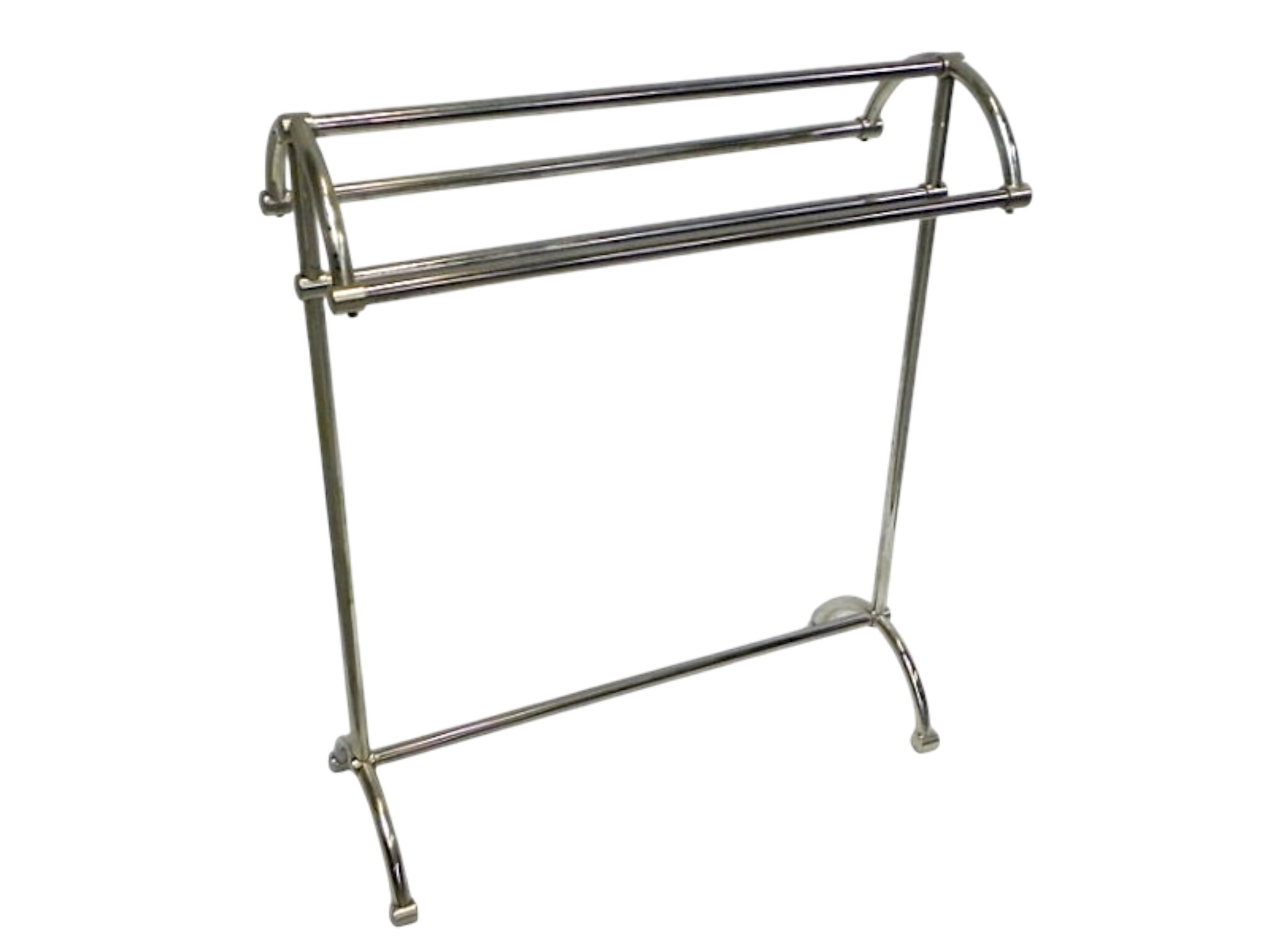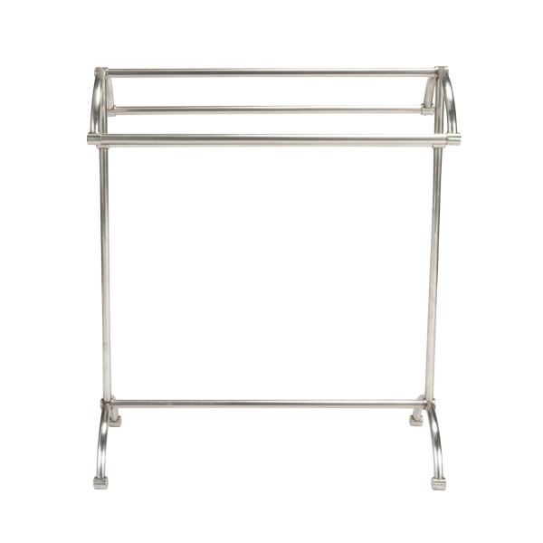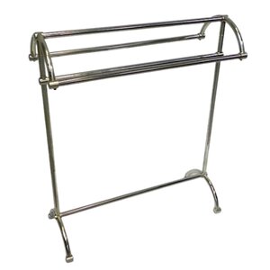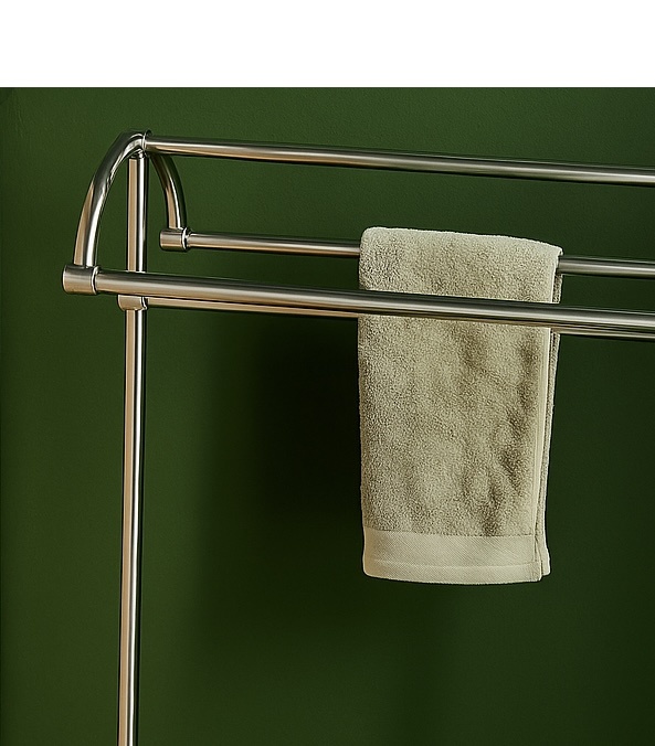 This sturdy, freestanding towel rack comes in a nickel satine finish. Inspired by vintage designs, it combines style with practicality. The rack features four horizontal bars, perfect for neatly hanging towels so they can dry properly. With its subtle satin sheen, it blends beautifully with both polished nickel and stainless steel/chrome finishes.