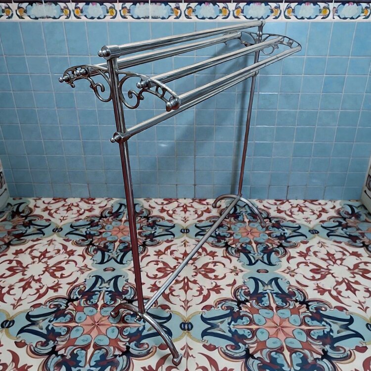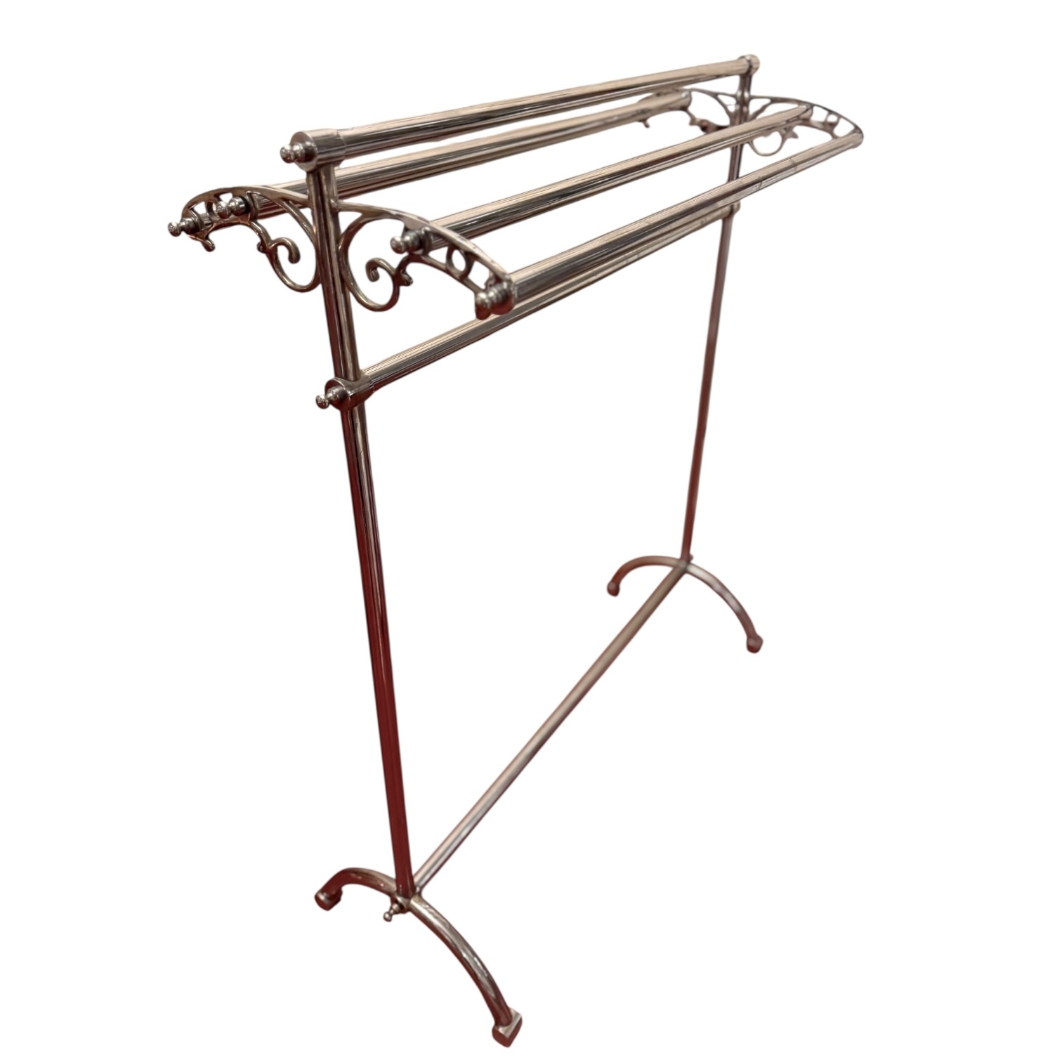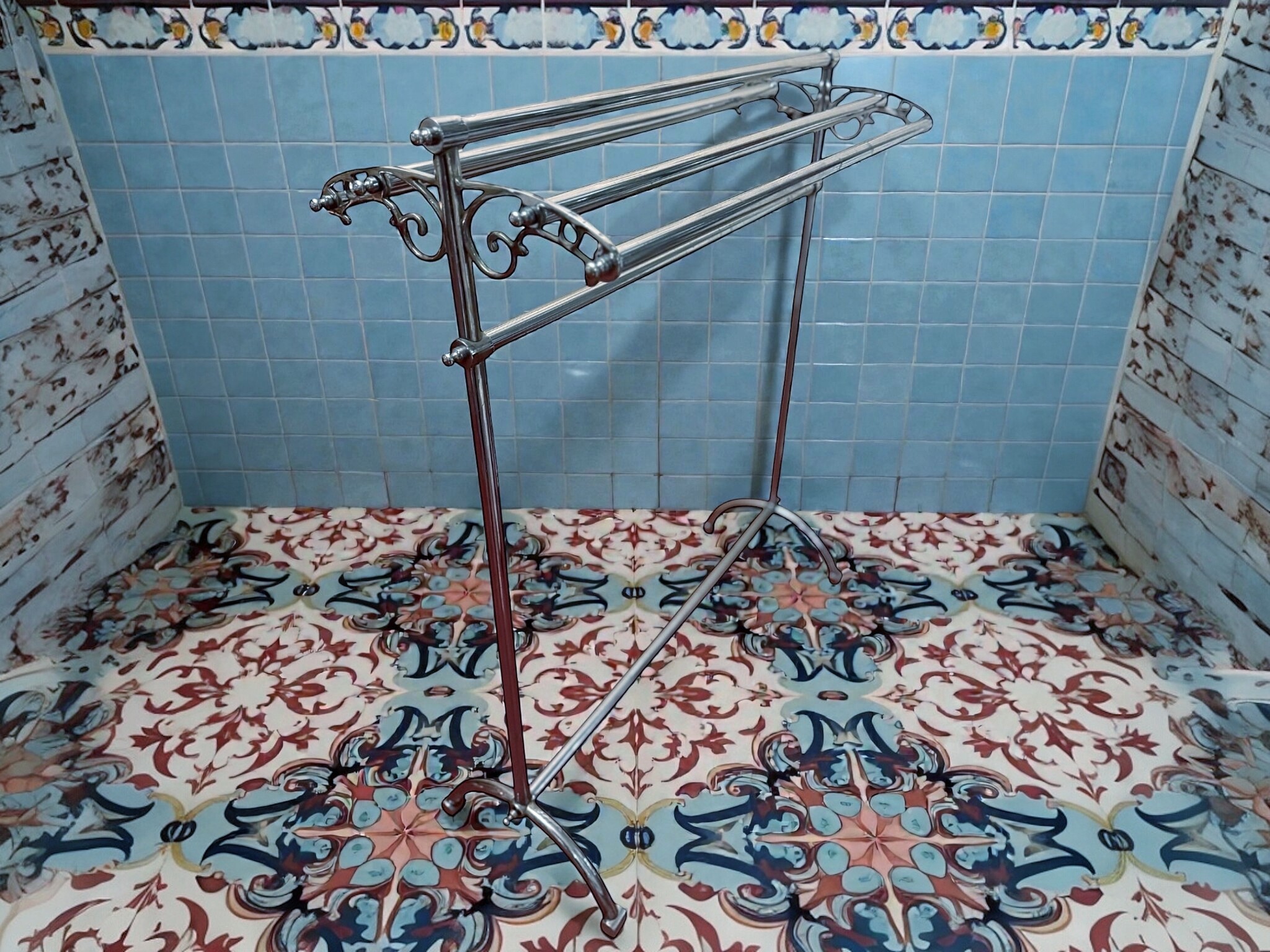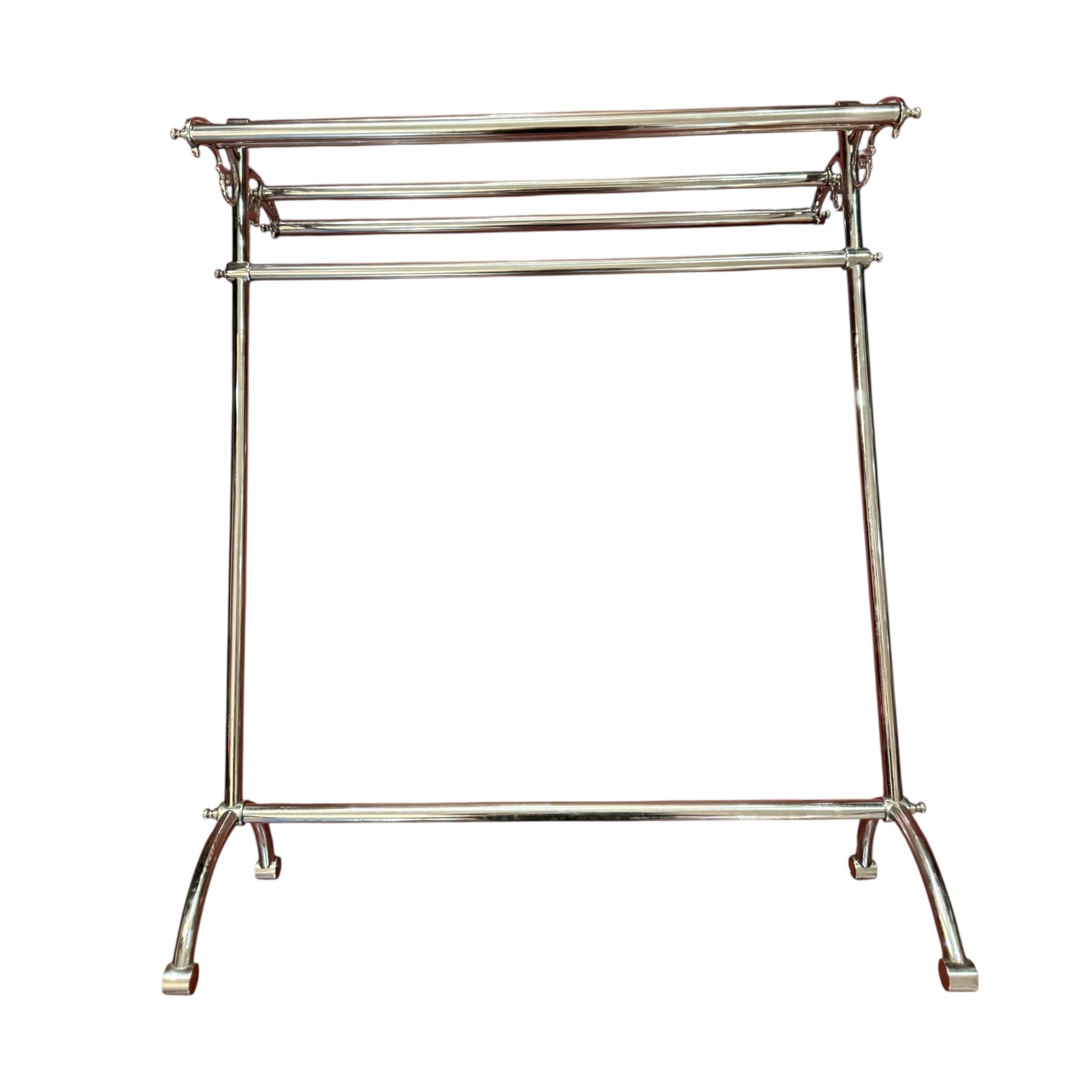 An elegant vintage-style freestanding towel rack in Ornate design, inspired by the original towel stands used around 1900 in bathrooms and dressing rooms. This model is a high-quality reproduction of those classic designs and finished in polished chrome.