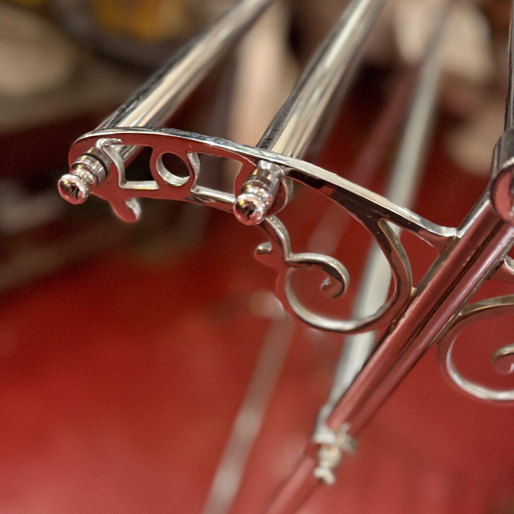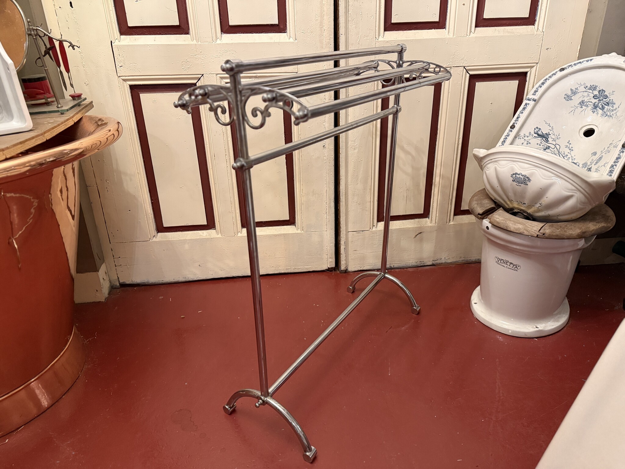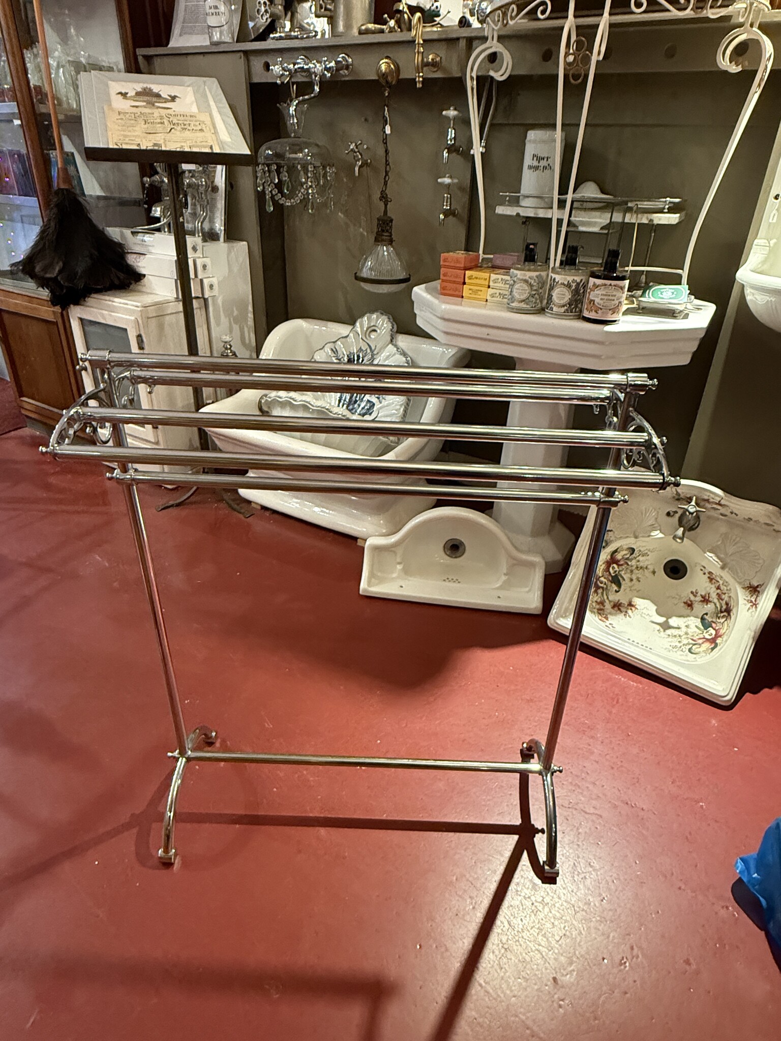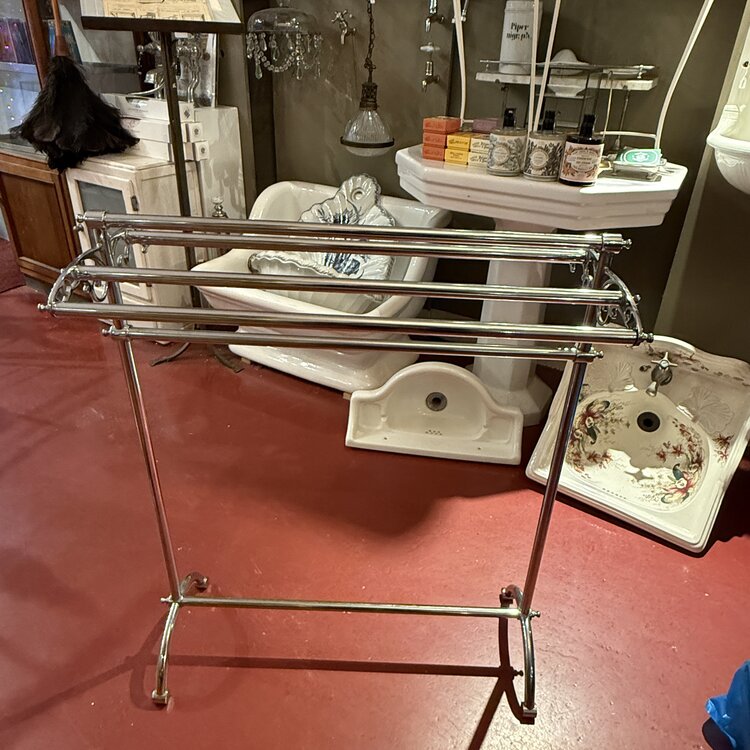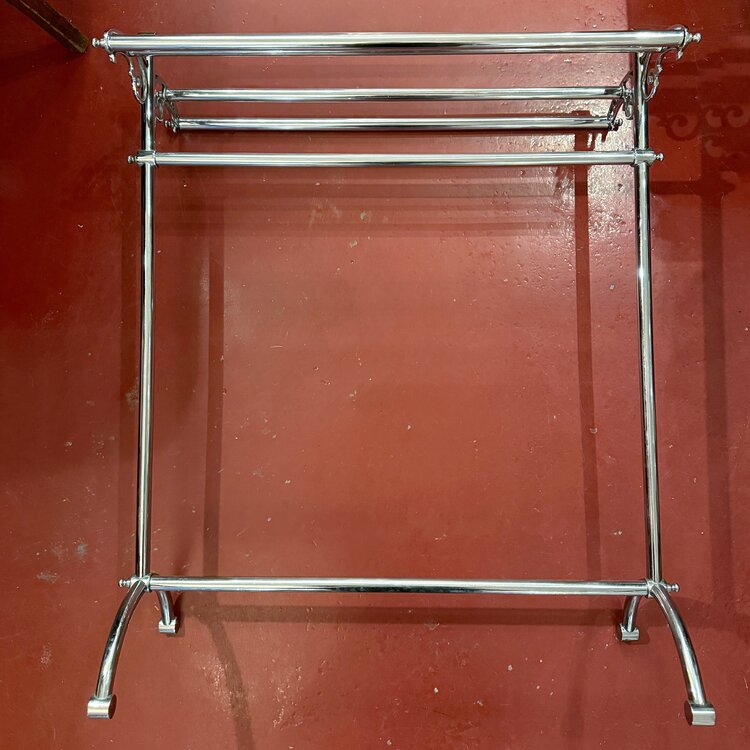 An elegant vintage-style freestanding towel rack in Ornate design, inspired by the original towel stands used around 1900 in bathrooms and dressing rooms. This model is a high-quality reproduction of those classic designs and finished in polished chrome.