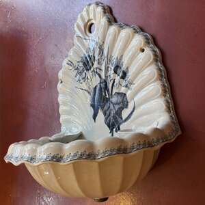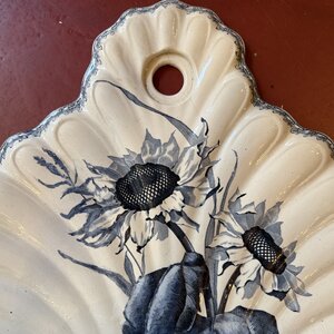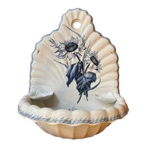 Antiek Fonteintje Tournesol. Antieke wasbakje voor toilet in schelpenvorm met decor van Zonnebloemen.