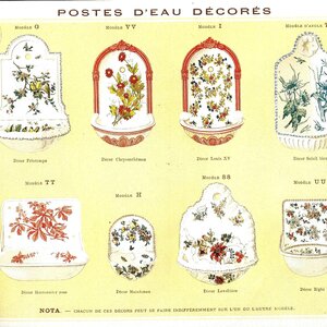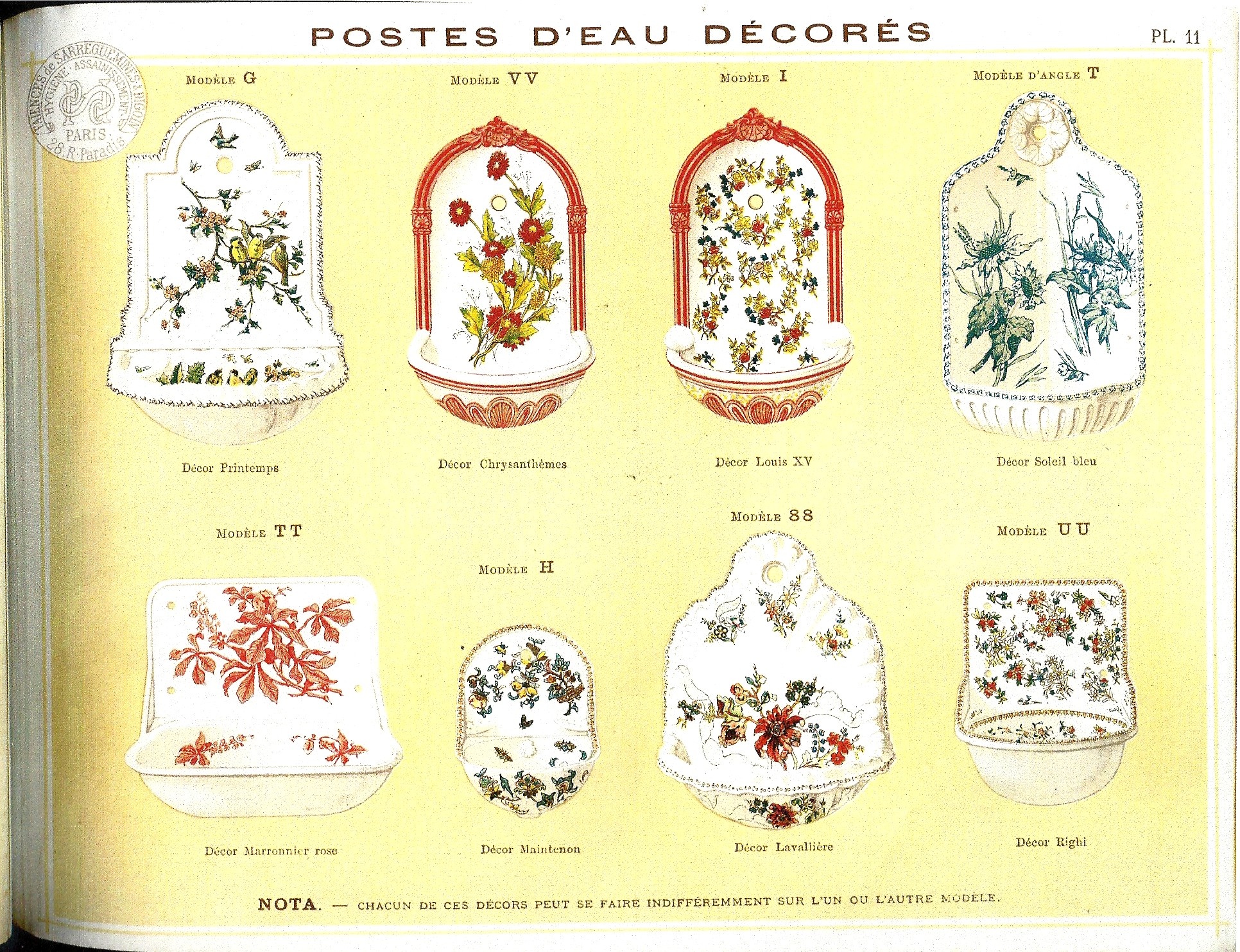 Een uitzonderlijk fraai en zeldzaam fonteintje uit het einde van de 19de eeuw, waarschijnlijk vervaardigd door de beroemde tegel- en sanitairfabriek Sarreguemines. Hetzelfde decor is terug te vinden in hun catalogus rond 1900.