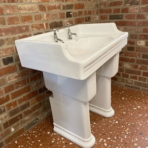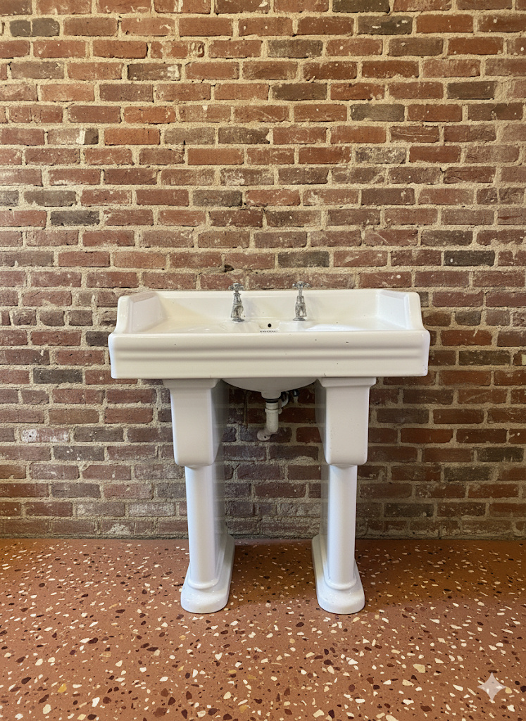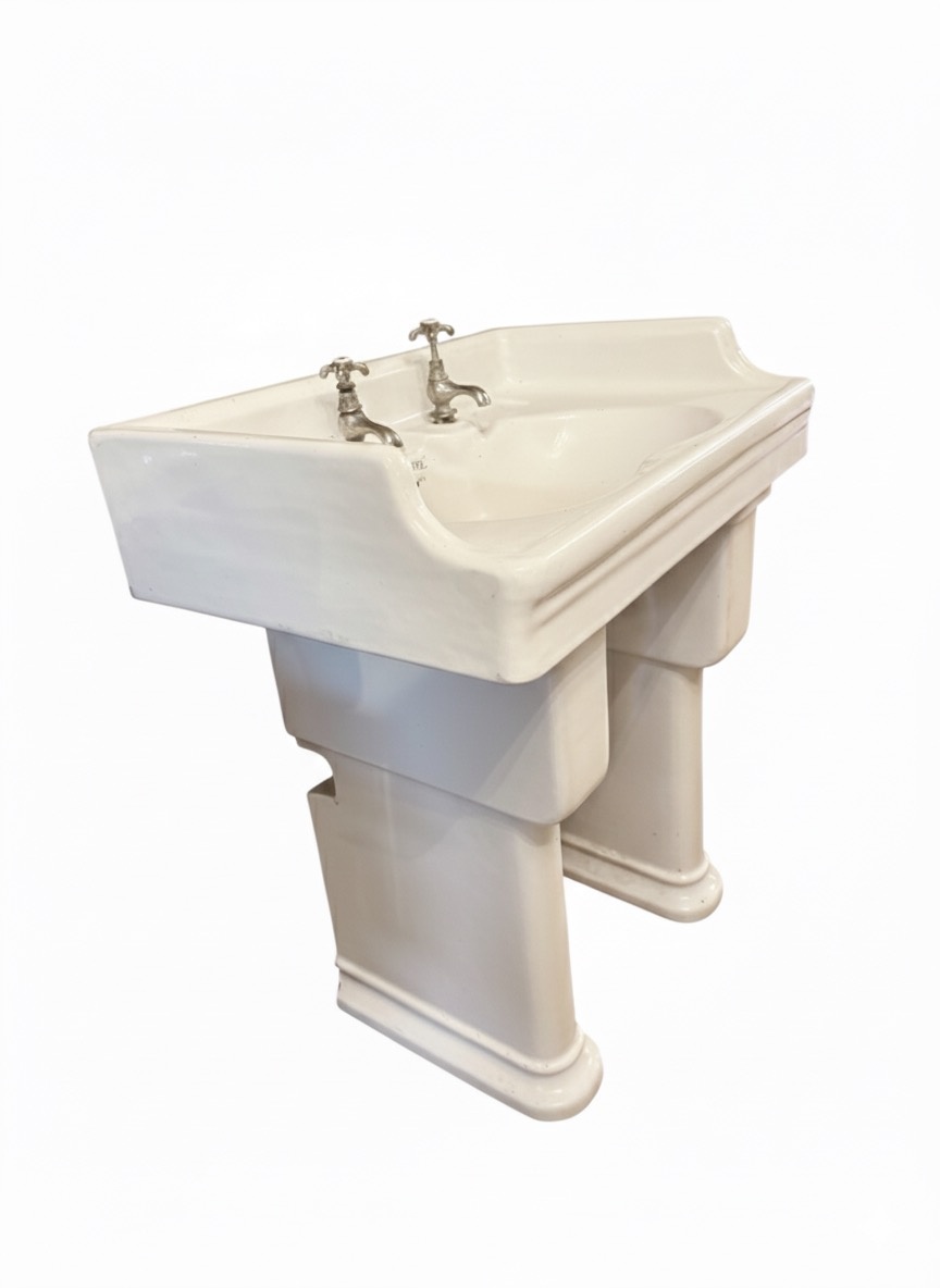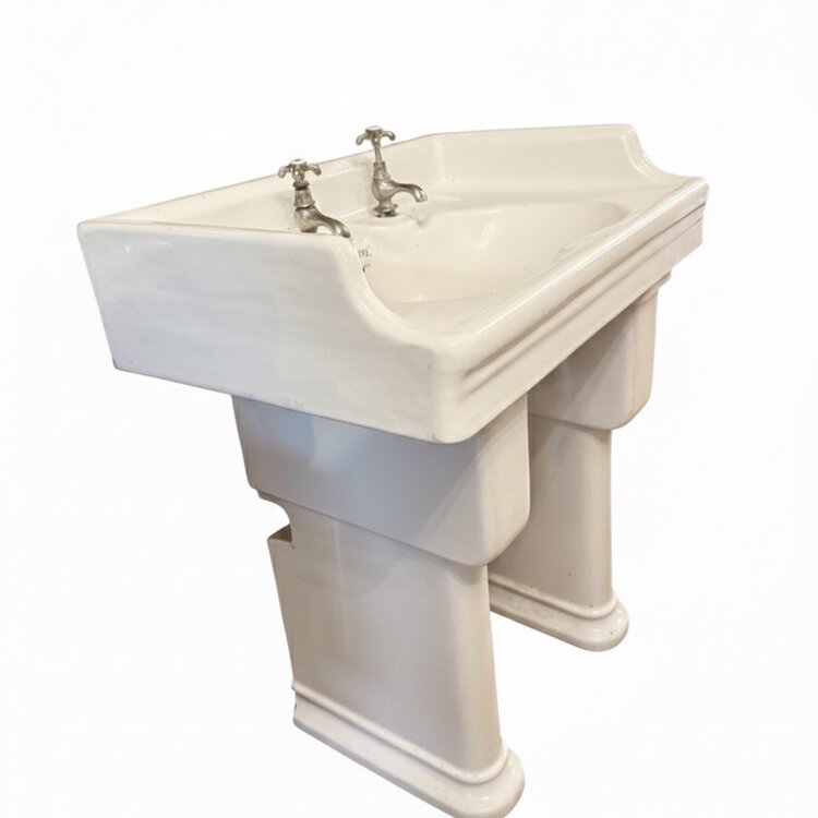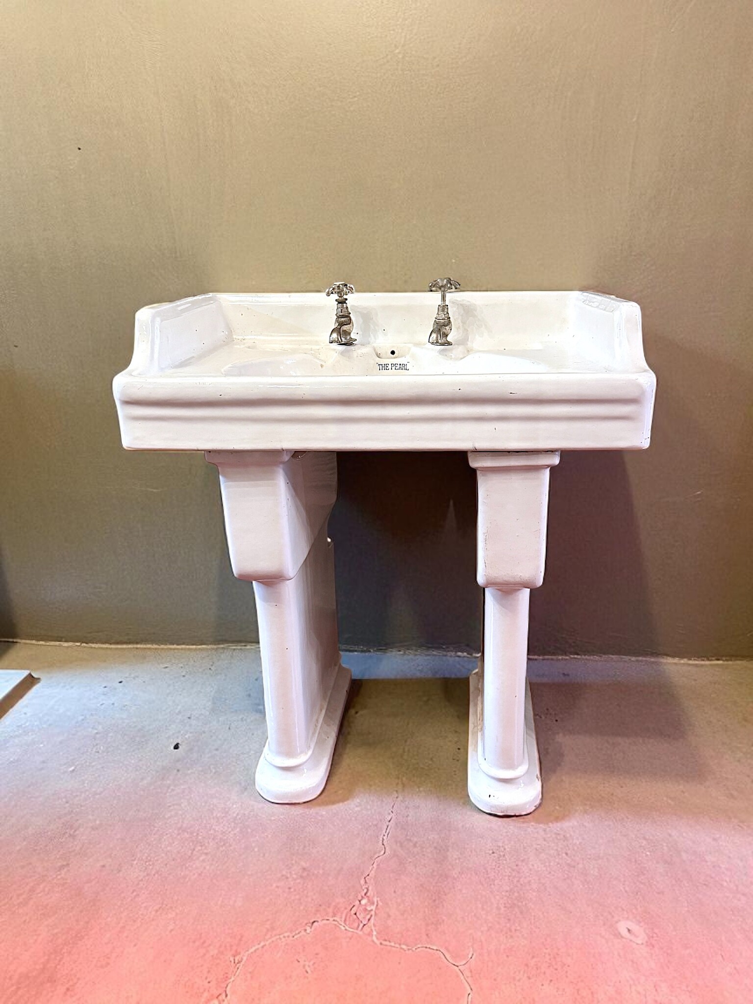 Deze bijzondere antieke wastafel, met de merknaam The Pearl duidelijk zichtbaar in het midden van de bak, werd rond 1900 vervaardigd in Engeland. Het strakke, bijna vierkante ontwerp en de twee robuuste keramieken poten geven de wastafel een uitgesproken utility karakter. Dergelijke modellen werden vaak geplaatst in Butler keukens van oude Engelse landhuizen en stadspanden, waar een strikte scheiding bestond tussen Upstairs (de familie) en Downstairs (het personeel).