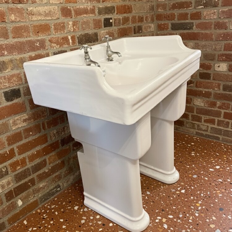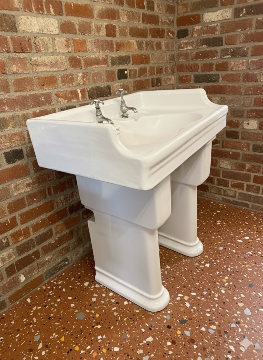 Door zijn formaat, de dubbele poten en de sobere maar stevige vorm is dit een bijzonder zeldzaam object. Ondanks de sporen van gebruik die passen bij zijn leeftijd, verkeert de wastafel in goede structurele staat en kan hij uitstekend opnieuw worden geïnstalleerd. Daarmee is hij klaar voor een tweede leven in een interieur waarin authenticiteit en karakter een belangrijke rol spelen.