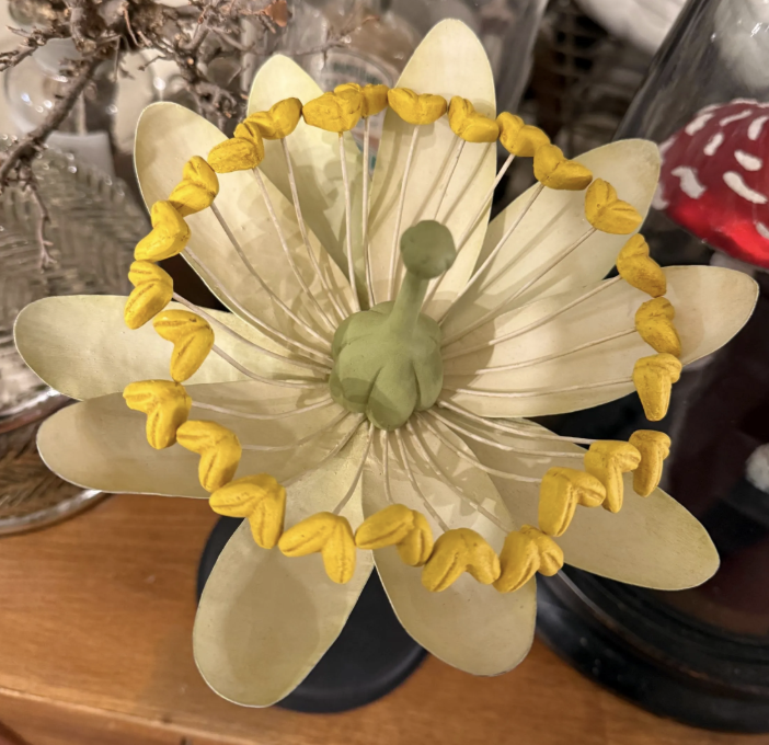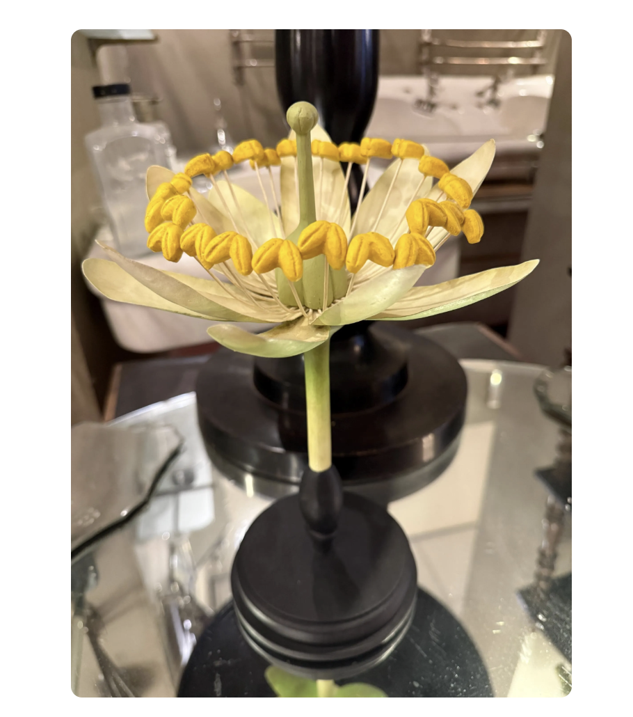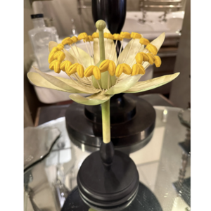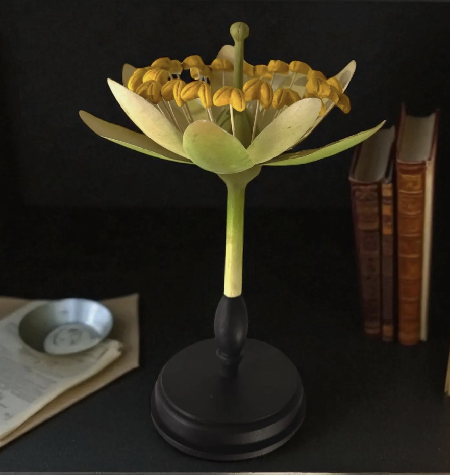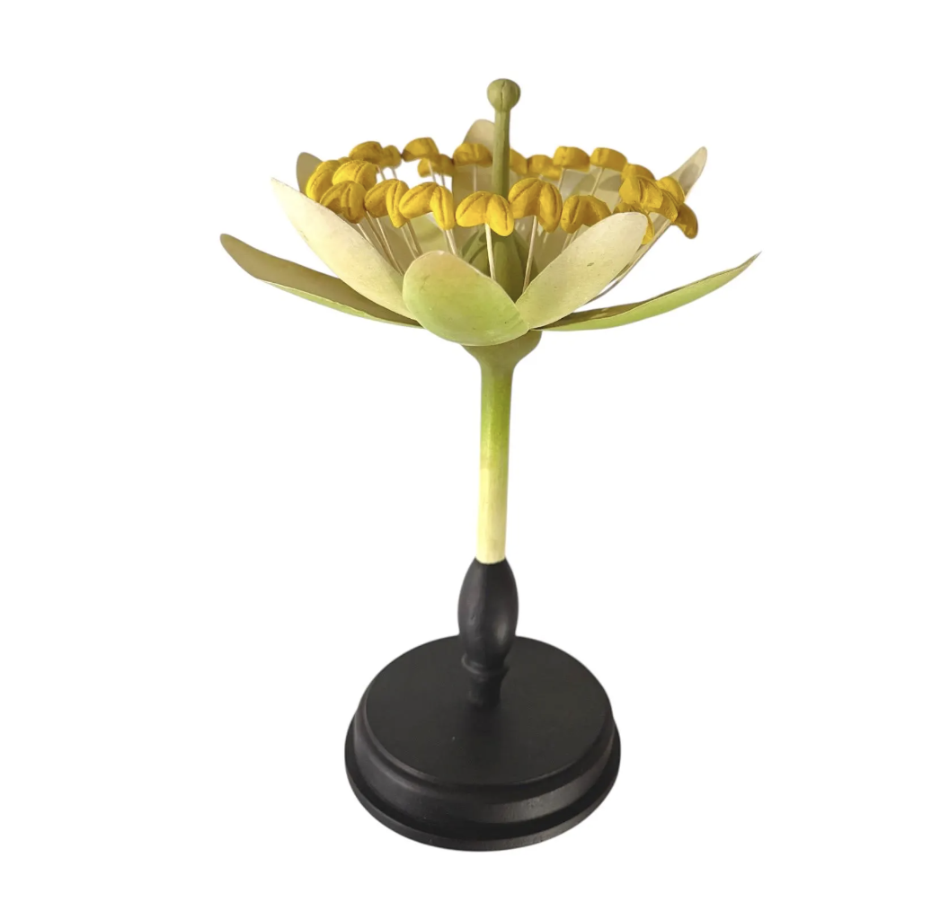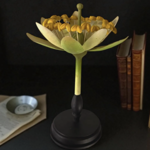 Het bovenste deel van het model is vervaardigd uit metaal, terwijl de bloem is gemonteerd op een ronde, gedraaide houten voet. De combinatie van ambacht, wetenschap en esthetiek maakt dit object tot een bijzonder decoratief stuk.
