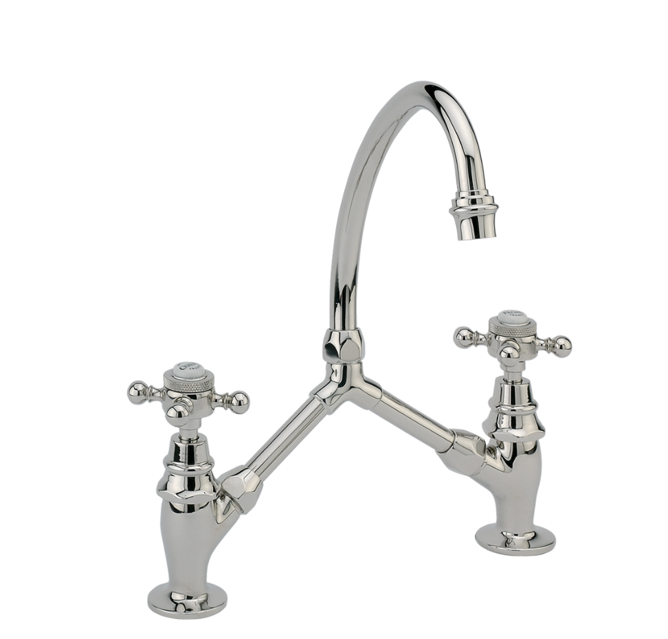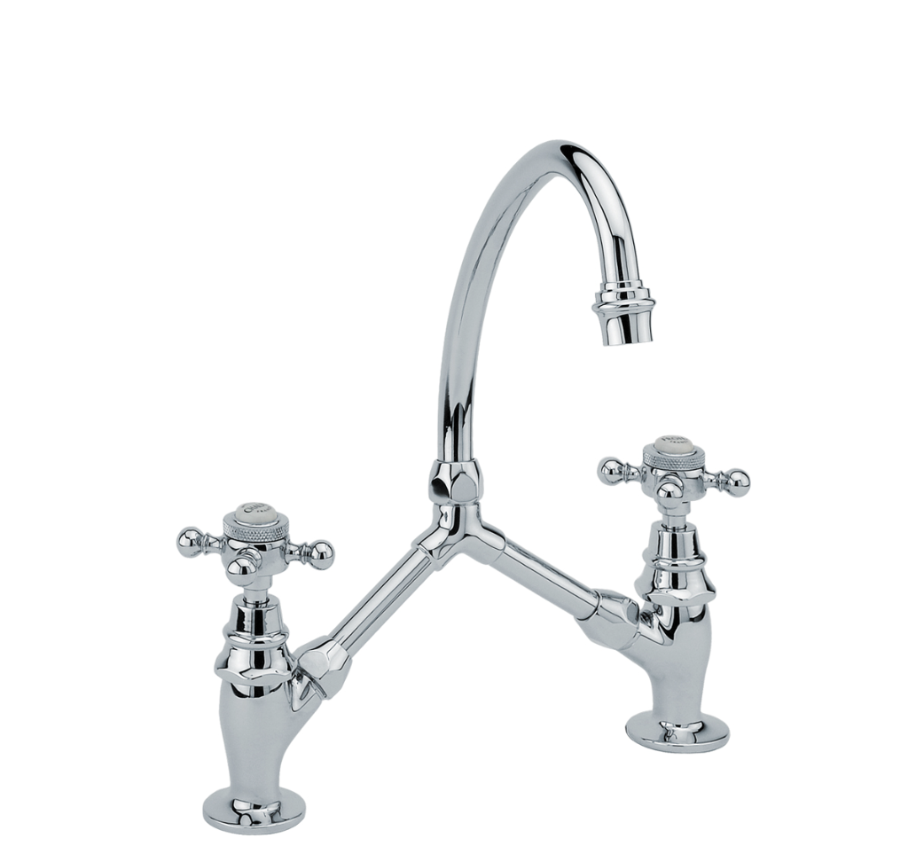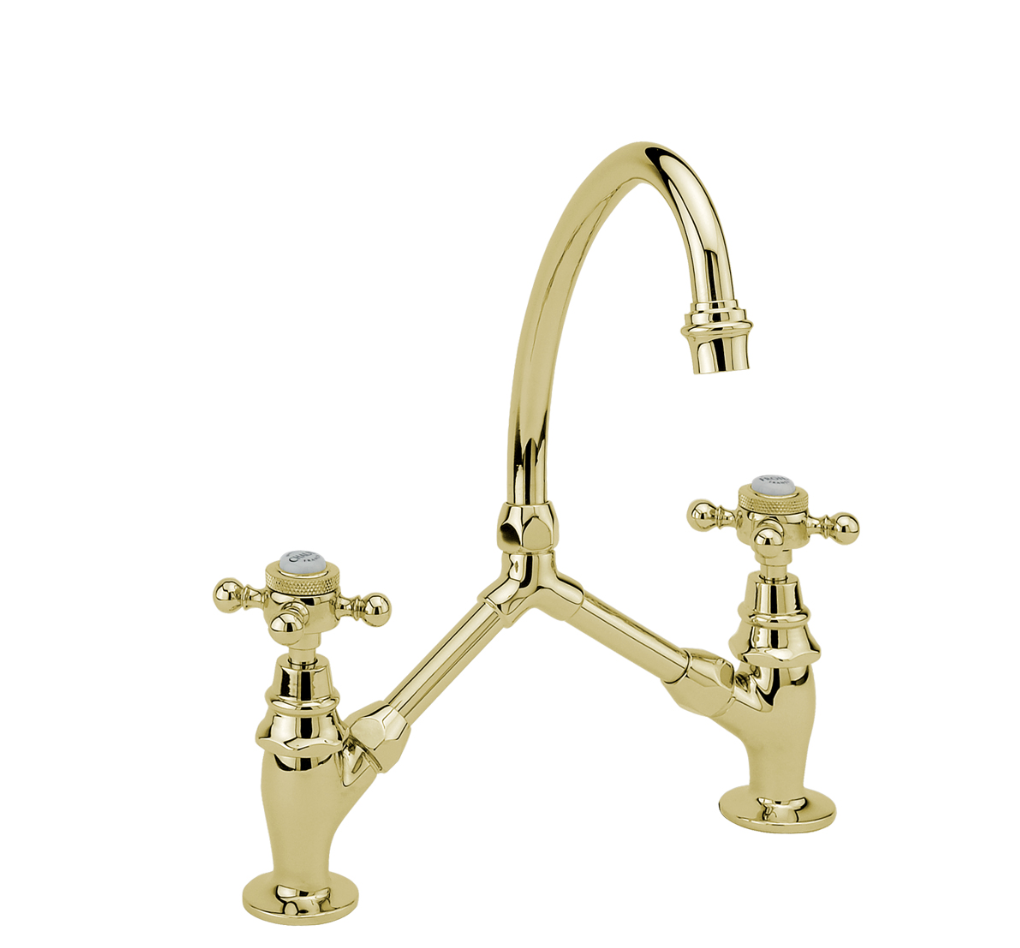 Een klassieke brugkraan met hoge, sierlijk gebogen en zwenkbare uitloop. Dit type kraan – ook wel twee-gats kraan genoemd – is bij uitstek geschikt voor wastafels met karakter en vormt een prachtig middelpunt in een klassieke of landelijke badkamer.