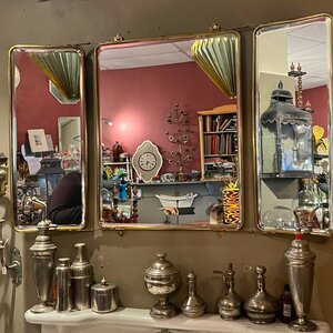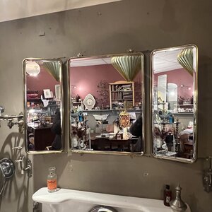 Geïnspireerd door een antiek Frans ontwerp uit de vroege jaren 1900, is deze drievoudige spiegel een echte Art Nouveau-schat. De vintage uitstraling gaat naadloos over in Art Deco-invloeden, waardoor het een statementstuk is in elk interieur. Oorspronkelijk te vinden in klassieke Franse kapperszaken, is deze elegante spiegel een tijdloze aanvulling op je huis.