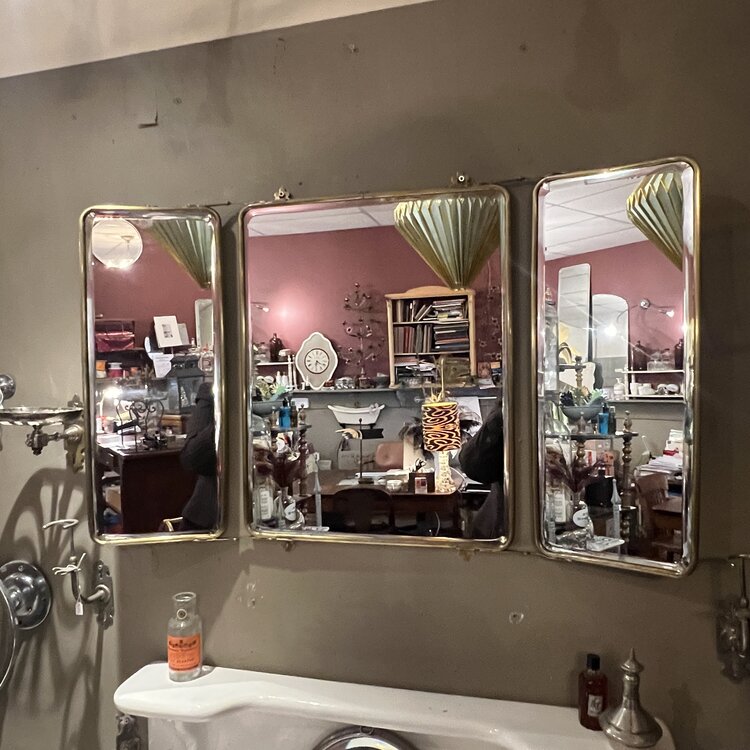 Grote drieluikspiegel voor boven een wastafel. Getrouwe replica van het model zoals dit aan het begin van de eeuw werd vervaardigd door de firma JB uit Parijs. Messing frame