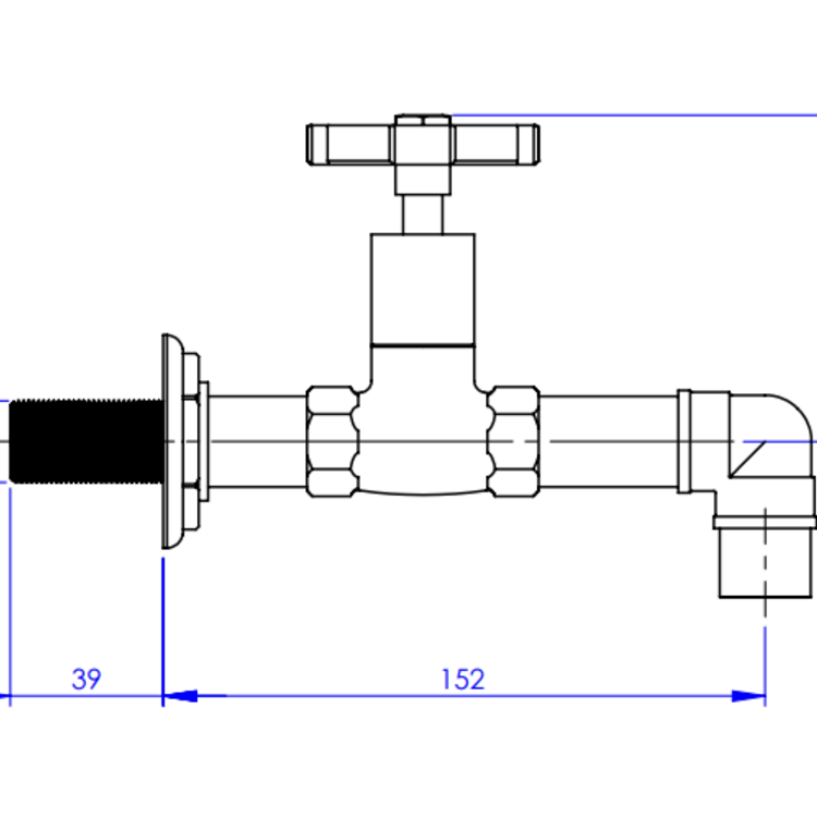 Een robuuste wandkraan voor koud water met een uitgesproken industriële uitstraling. De karakteristieke kruisgreep en zichtbare verbindingen verwijzen naar de techniek en vormtaal van de machine age, waarin functionaliteit en mechanische schoonheid centraal stonden.