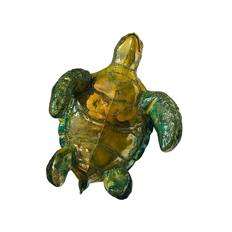 Zeeschildpad in de kerstboom! Prachtige glazen kerstornamenten voor een onderwaterwereld in de kerstboom. Een majestueuze zeeschildpad, rustig voortglijdend alsof ze net uit de oceaan komt. Deze kerstbal toont de schildpad in volle pracht: een sierlijk gevormd groen schild met gouden accenten, zorgvuldig geschilderde vinnen en een kalme, wijze blik. De zeeschildpad staat symbool voor levenswijsheid, geduld en de eeuwige reis – een prachtige toevoeging aan een boom vol natuur, zeeleven of symboliek.