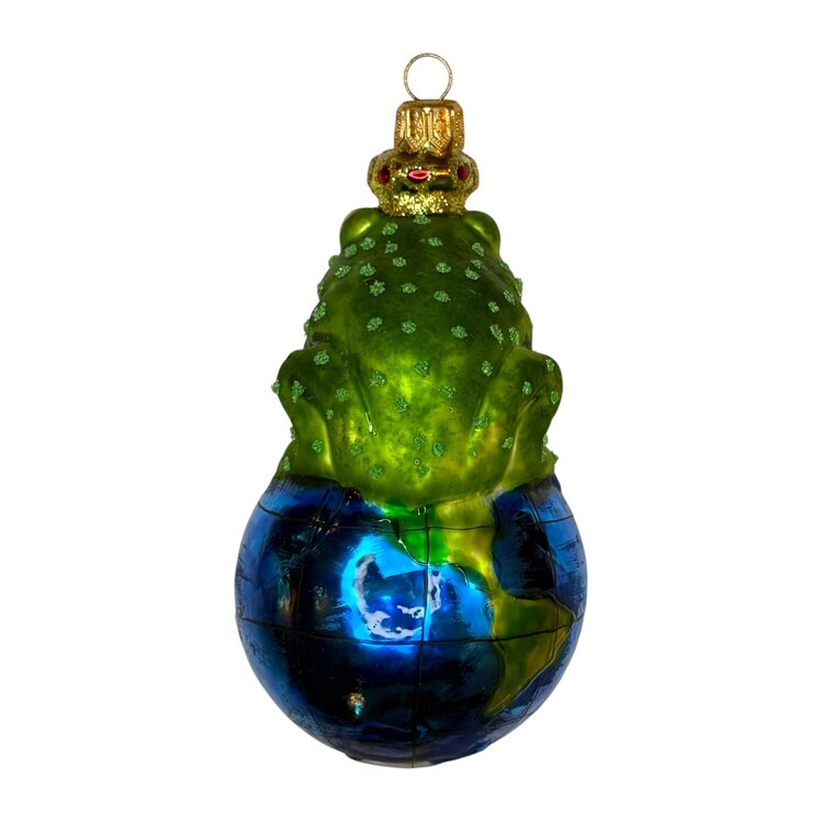 De bol is prachtig beschilderd met wereldkaartmotief in diepe blauw- en groentinten, terwijl de kikker fonkelt in glanzend groen. Een verrassende blikvanger in de kerstboom.