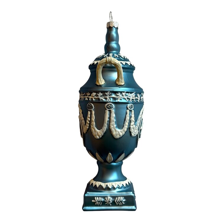 Een sierlijke kerstbal in de vorm van een klassieke urn – een elegant en tijdloos ontwerp dat verwijst naar klassieke vormen uit de oudheid. Deze glazen urn is met de mond geblazen en met de hand gedecoreerd in een zachte blauwtint, met fijne lijnen en motieven in empirestijl. Dit ornament past prachtig binnen een klassieke of barokke boomdecoratie maar doet het als blikvanger ook verrassend goed in een moderne setting.