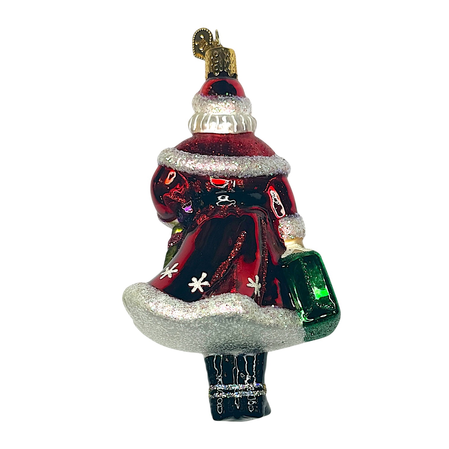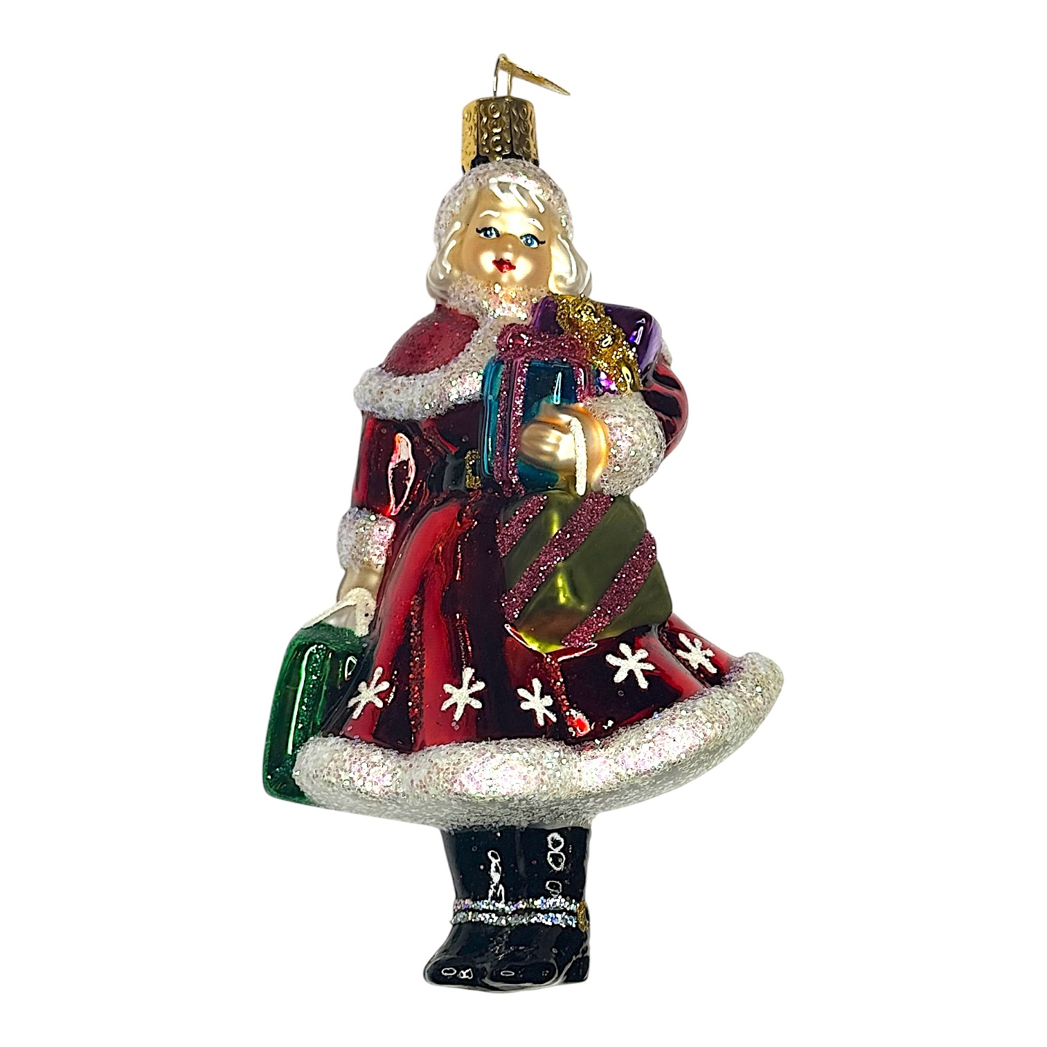 Deze vrolijke kerstbal toont Mevrouw Claus tijdens een gezellig dagje kerstinkopen. Gehuld in haar klassieke rode mantel met witte bontafwerking draagt ze vol enthousiasme haar mooi ingepakte cadeautjes. Haar warme glimlach geeft haar een levendig karakter. Mevrouw Claus – vaak in de schaduw van de Kerstman – komt in dit ornament zelfverzekerd en actief naar voren. Ze staat symbool voor zorgzaamheid, gezelligheid en de onmisbare kracht achter de schermen van het kerstfeest. Een luchtige, humorvolle én liefdevolle toevoeging aan je boom, die past in zowel klassieke als speelse kerststijlen.