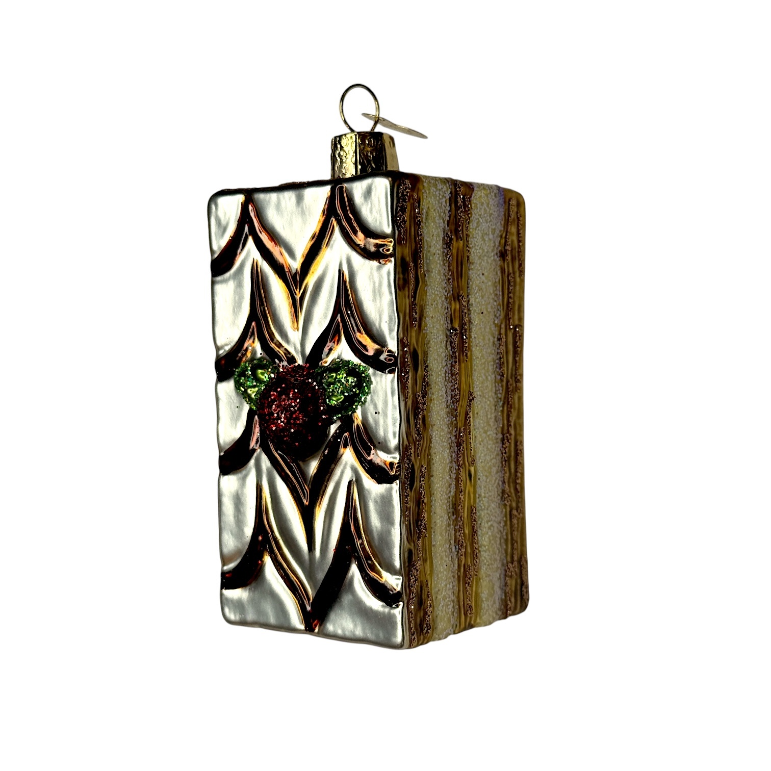 Taartje in de kerstboom! Een heerlijk ogende kerstbal in de vorm van een klassiek Frans mille-feuille gebakje – met lagen room, bladerdeeg en een glanzend geglazuurde bovenkant met het kenmerkende marmerpatroon. Deze feestelijke lekkernij, ook wel tompouce of napoleon genoemd, brengt patisserie-charme en een vleugje zoetheid in de kerstboom. Perfect voor fijnproevers en liefhebbers van decoratie met een knipoog naar de bakkunst.