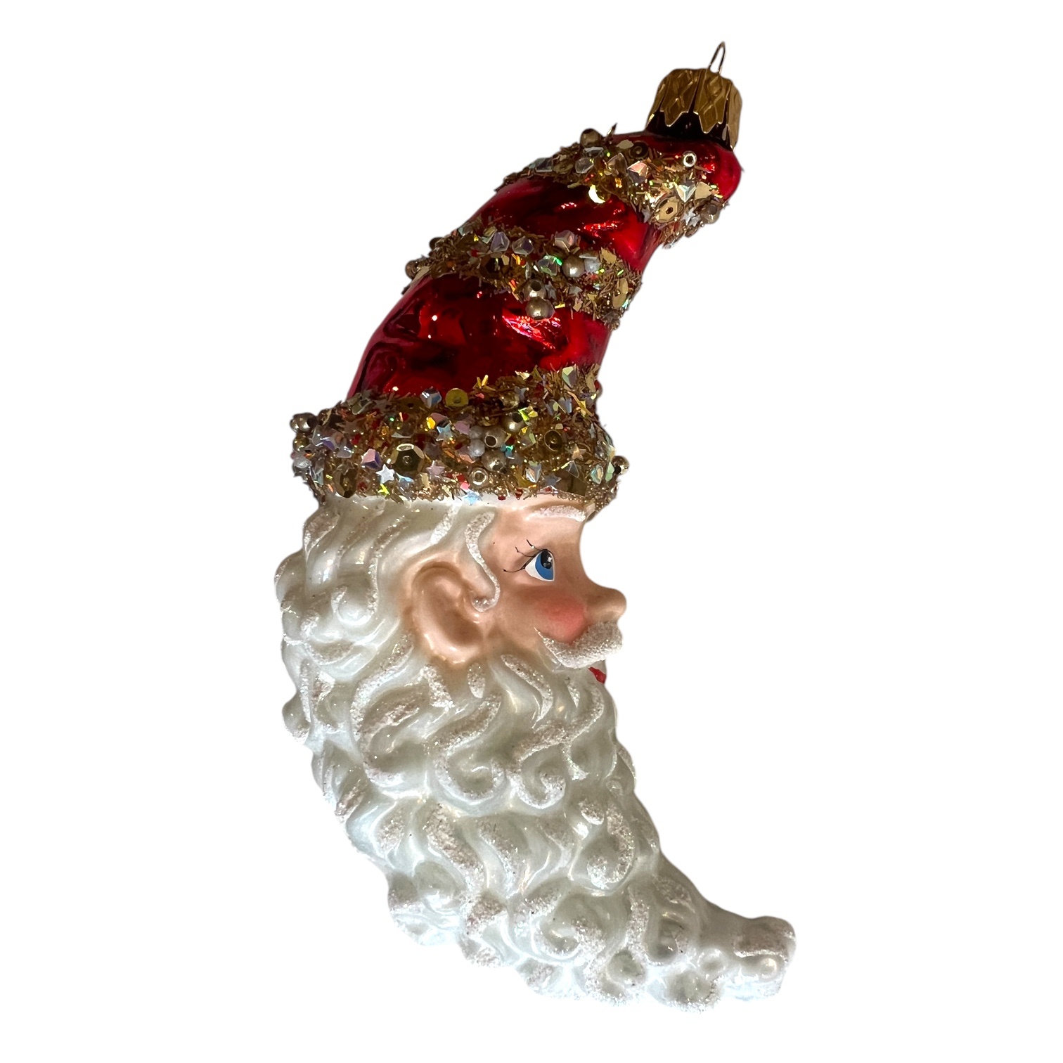 Santa maan in de kerstboom! Klassieke kerstbal voor een traditionele kerstboom. Breng een vleugje kerstmagie en dromerige charme naar je decoratie met deze handgemaakte glazen Kerstman maan. Dit unieke ornament, waarin de kerstman en de maan samenkomen, is perfect voor iedereen die houdt van sprookjesachtige en vrolijke kerstversieringen.