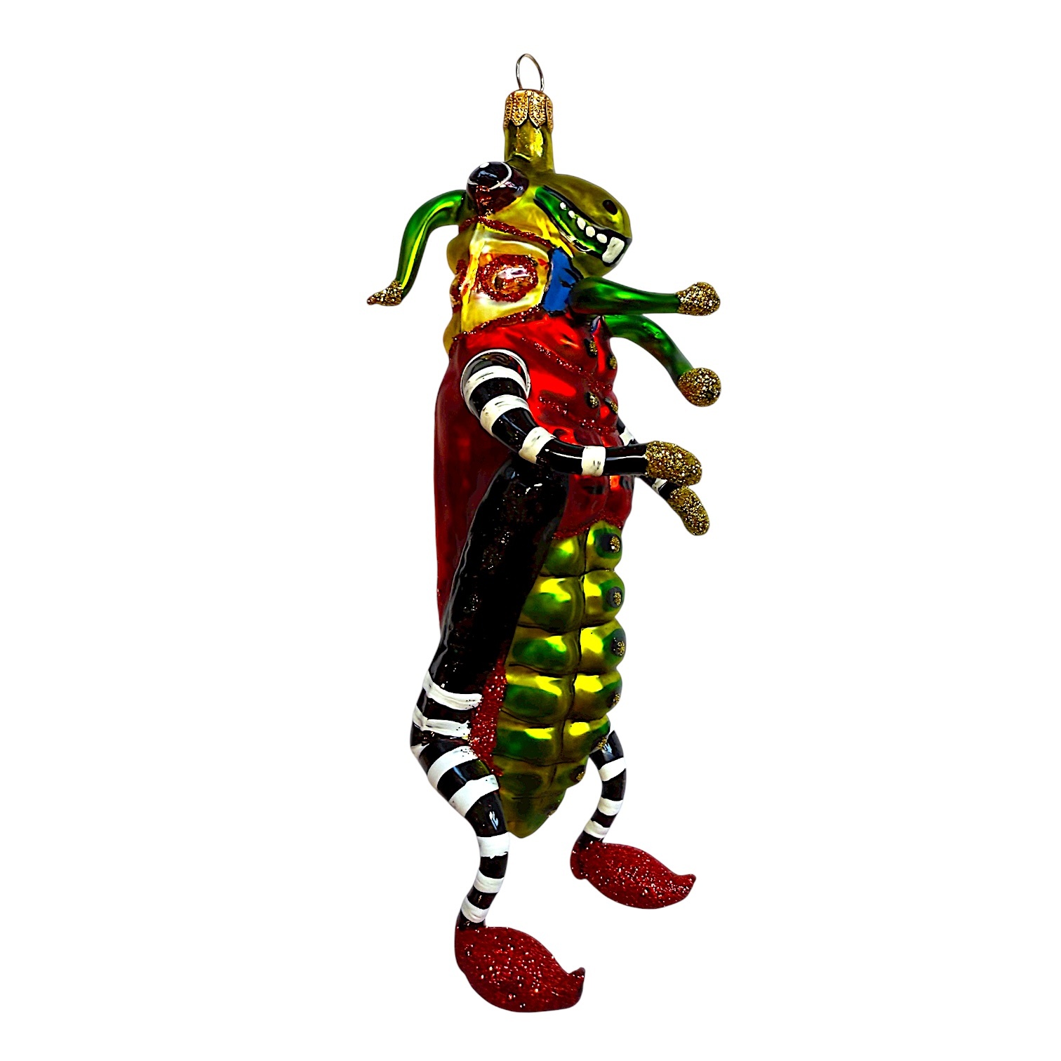 Excentriek, vrolijk en een tikkeltje absurd – deze mondgeblazen glazen kerstbal toont een fantasierijke sprinkhaan verkleed als joker Met zijn guitige blik brengt hij luchtigheid en verbeeldingskracht in de kerstboom. Een verrassende keuze voor wie houdt van theatrale ornamenten, fantasiedieren en een kerst vol humor en karakter.