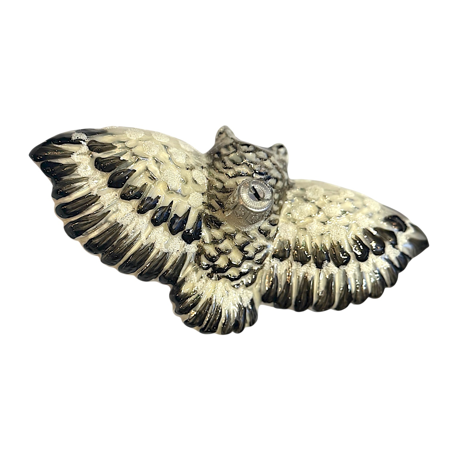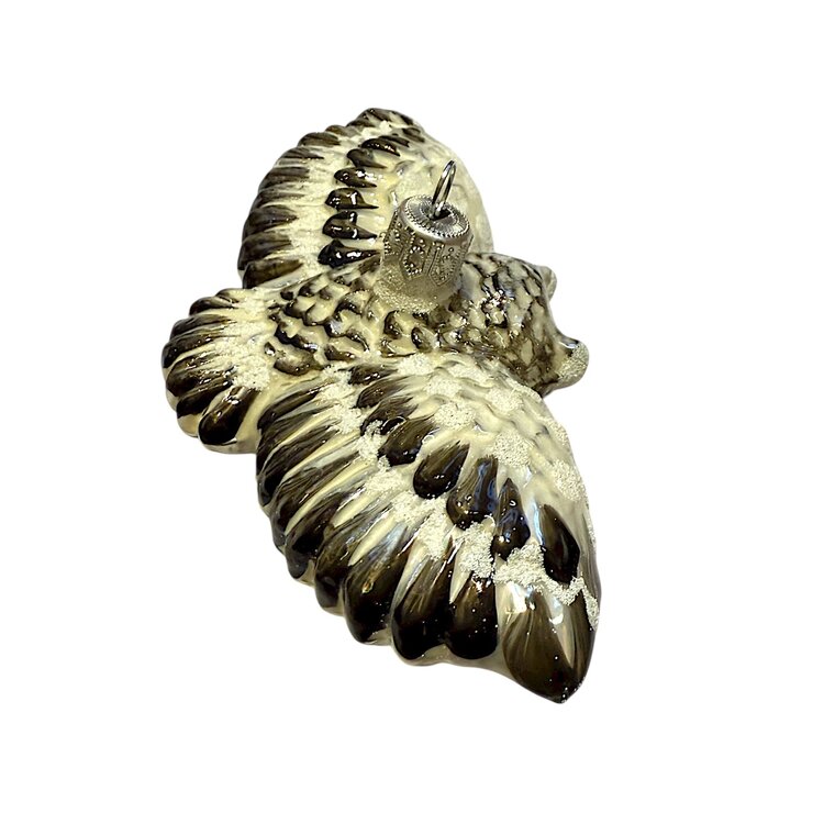 Als symbool van vreugde en geluk mag een vogel in de kerstboom niet ontbreken. Deze betoverende kerstbal toont een vliegende witte uil – een magisch tafereel in glas gevangen. De uil in volle vlucht roept beelden op van winterse bossen, mysterie en stilte onder een met sneeuw bedekte hemel. In vele culturen staat de witte uil symbool voor wijsheid, intuïtie en bescherming.