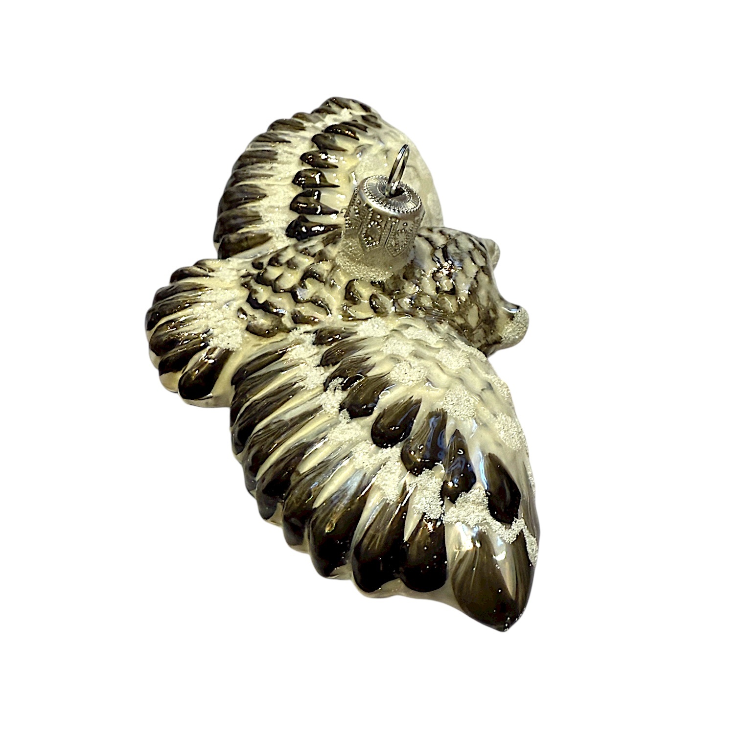 Mondgeblazen en met de hand gedecoreerd in Europa, volgens traditionele ambachtstechnieken. De sierlijke vleugels, het zachte glanzende verendek en de intense blik maken dit ornament tot een blikvanger in elke boom. Perfect voor liefhebbers van mythische dieren en verfijnde kerstversiering.