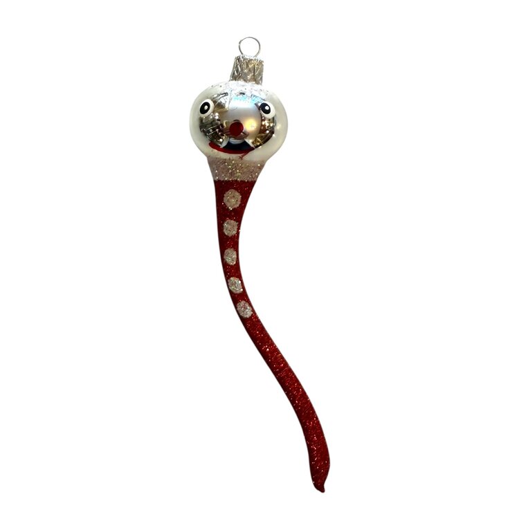 Deze kerstbal brengt een glimlach in de boom: een vrolijk wormpje met grote ogen, een zilveren kopje en een lang, kronkelend rood lijfje vol glitters en stippen. Het is een prachtig voorbeeld van vrij geblazen glas: zonder mal gevormd, dus elk ornament krijgt zijn eigen unieke vorm en expressie.