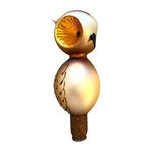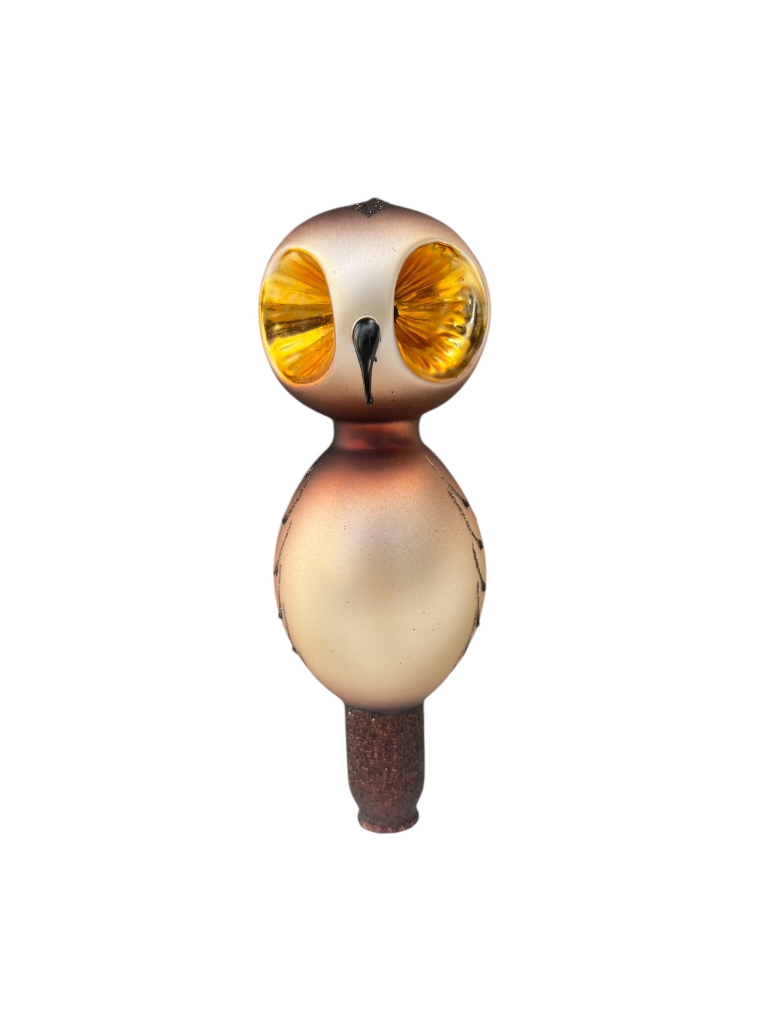 Een piek als een klein kunstwerk: dit gestileerde uiltje met zijn grote amberkleurige ogen trekt meteen de aandacht. Het simplistische ontwerp, de zachte bruintinten en de heldere oogschijven geven het ornament een modern sprookjesachtig karakter – als een uil uit een Scandinavisch prentenboek.