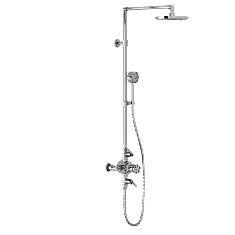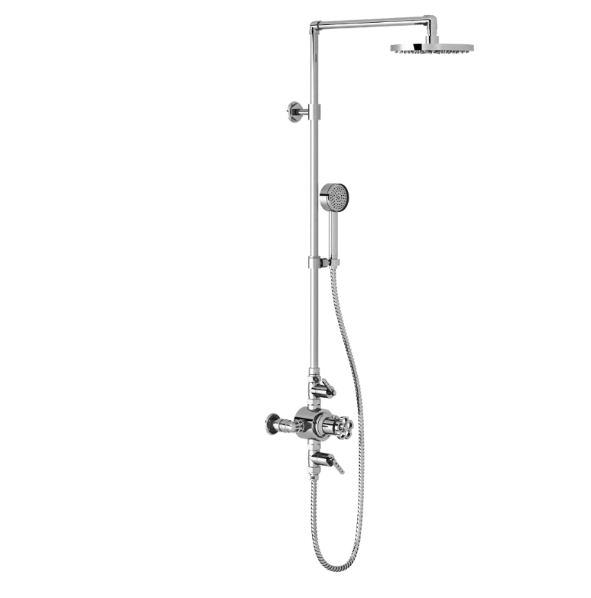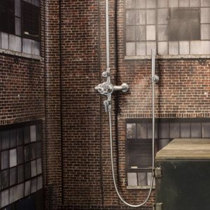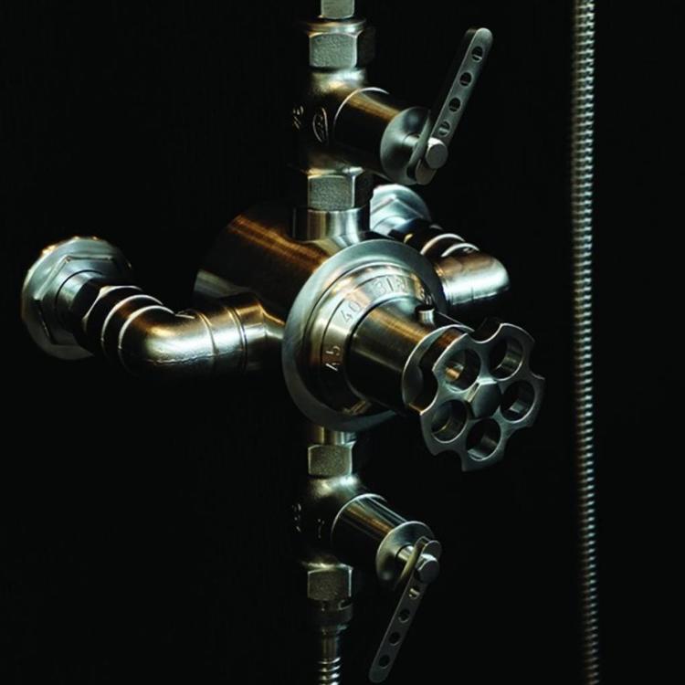 Een thermostatische douche met een krachtige industriële uitstraling, geïnspireerd op kranen uit de machine age. De zichtbare techniek, robuuste vormen en verfijnde details geven deze douche een uitgesproken karakter, terwijl de hoogwaardige afwerking en keramische binnenwerken zorgen voor comfortabel en betrouwbaar gebruik.