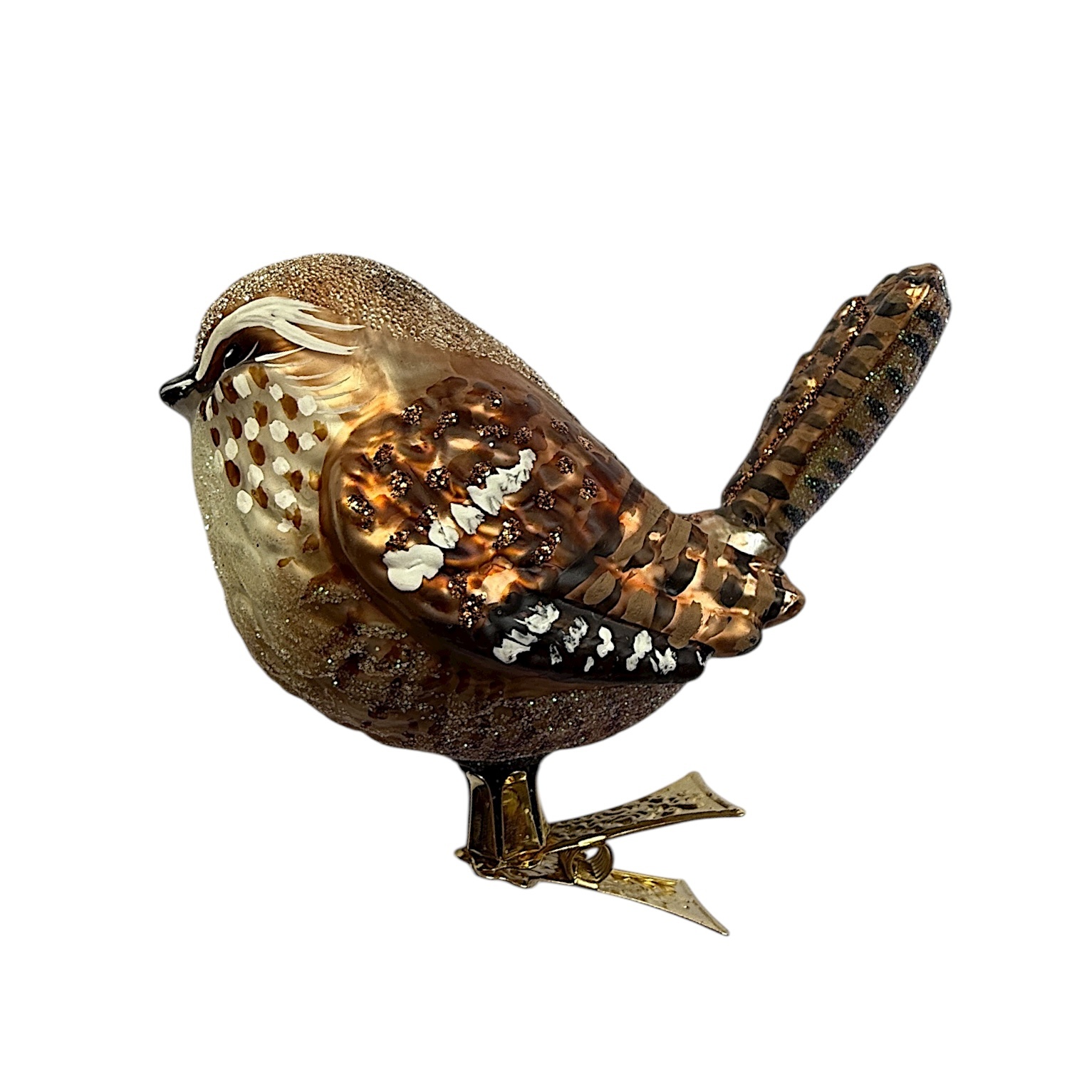 Als symbool van vreugde en geluk mag een vogel in de kerstboom niet ontbreken. Deze kerstbal toont een winterkoninkje – een van de kleinste, maar meest geliefde vogels van Europa. Met zijn opgerichte staartje, ronde lijfje en alerte oogjes is hij prachtig gevangen in glas. De warme bruintinten van zijn verenkleed zijn met zorg met de hand aangebracht, met een vleugje glitter op de vleugels en borst, alsof hij net uit een rijp bedekt struikje is gevlogen.