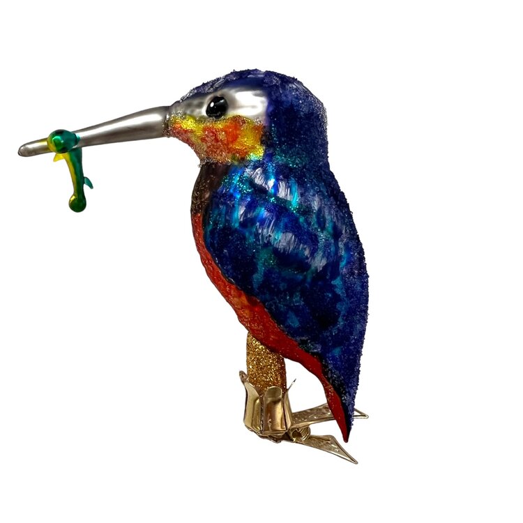 Mondgeblazen en met de hand beschilderd in Europa. Elk detail – van het visje tot de iriserende vleugels – is met uiterste zorg aangebracht. Een prachtig ornament voor liefhebbers van vogels, waterlandschappen en sfeervolle, natuurgetrouwe kerstdecoratie.